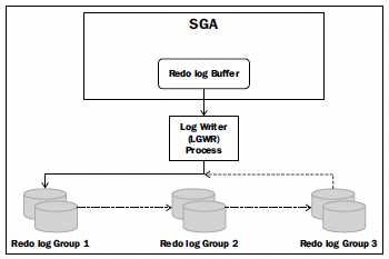 The redo log consists of groups of redo log files. A group consists of a redo log file and its multiplexed copies. Each identical copy is said to be a member of that group, and each group is identified by a number. The LGWR process writes redo records from the redo log buffer to all members of a redo log group until the file is filled or a log switch operation is requested. Then, it switches and writes to the files in the next group. Redo log groups are used in a circular fashion, as shown in the following figure: