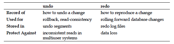 Another common question relates to the difference between redo log entries and undo information saved as part of transaction management. While redo and undo data sound almost like they could be used for the same purpose, such is not the case. The following table spells out the differences: