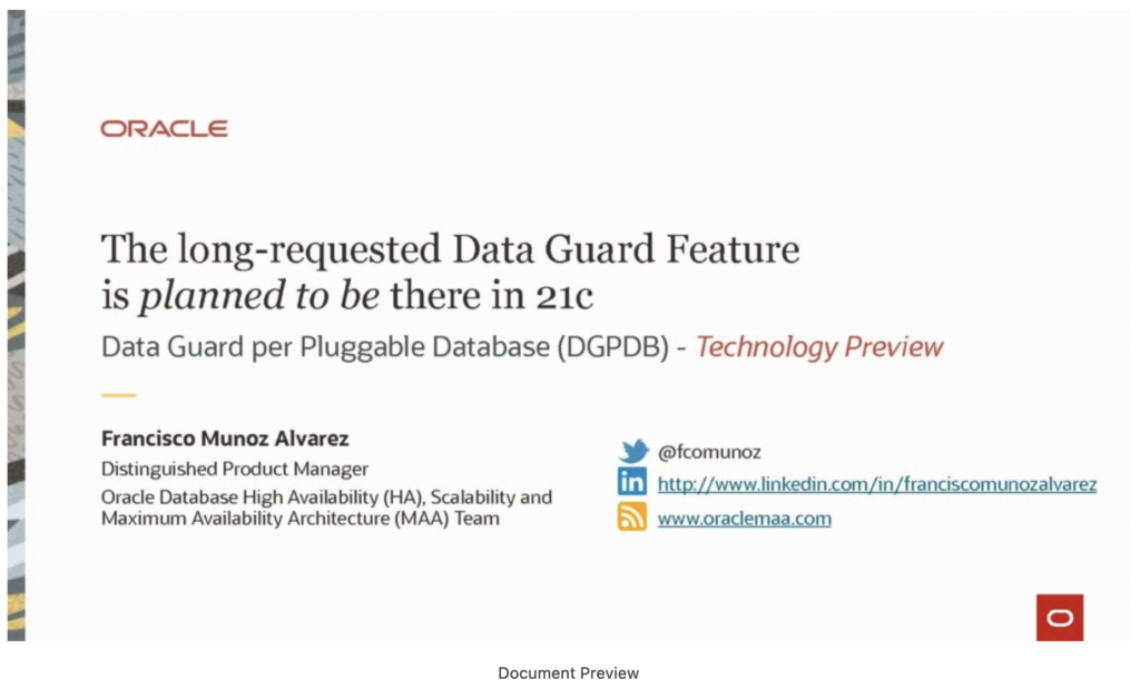 This is the preview of the new long-requested Data Guard feature called, Data Guard per Pluggable Database (DGPDB). This presentation was first given by me at the Blueprint 4D conference in Las Vegas in June 2022.