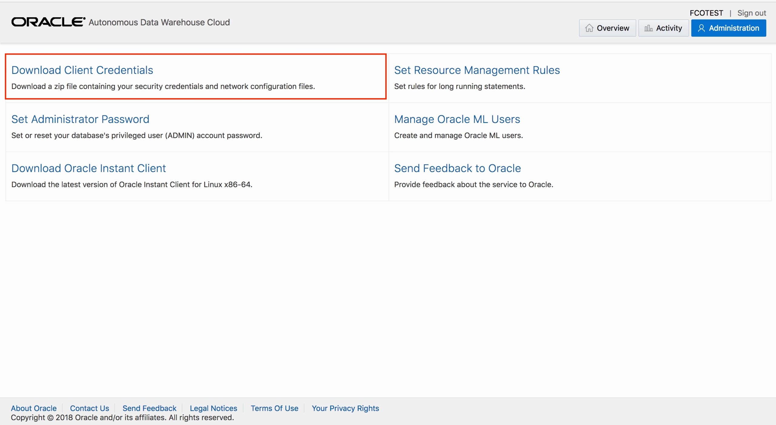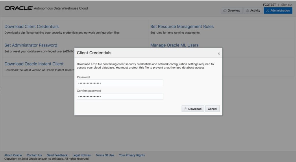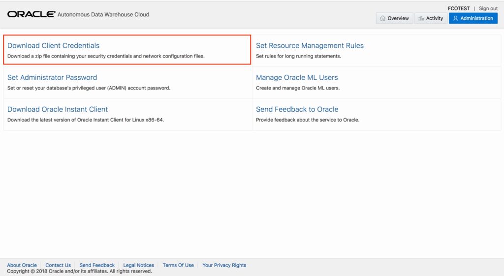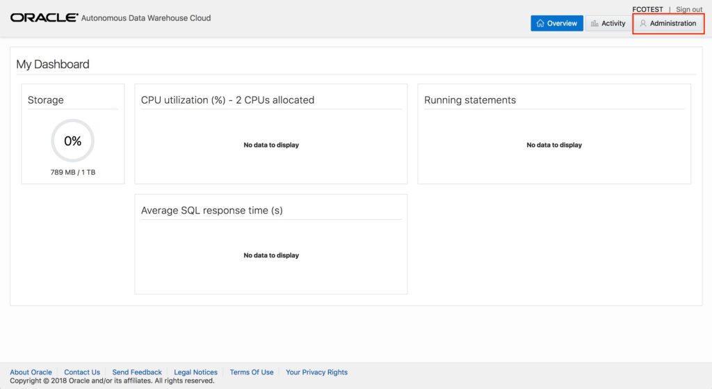 You will then land at the Autonomous Data Warehouse Cloud Dashboard. Please click on “Administration” on the top right corner of the screen.