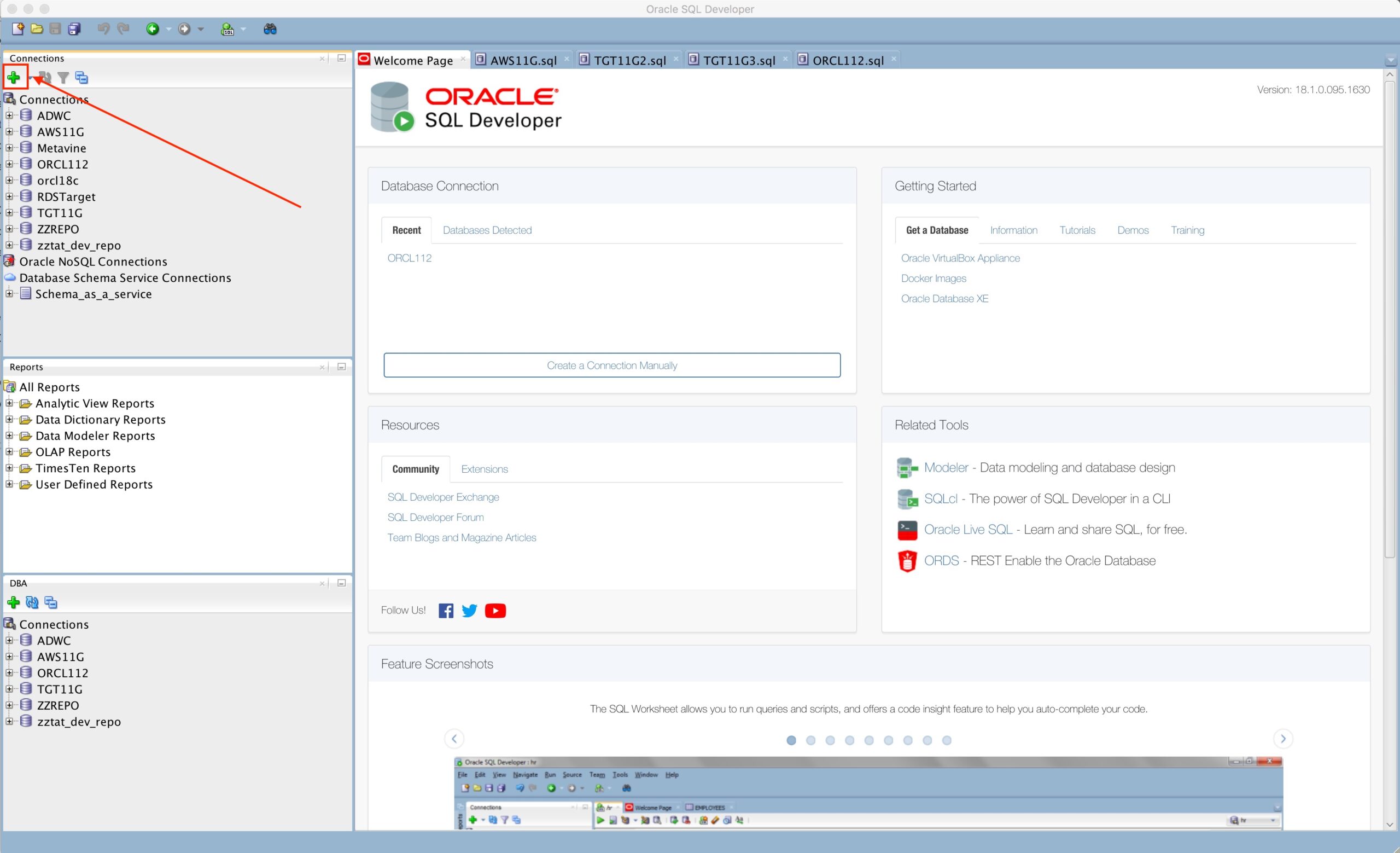 Now that you downloaded the Client Credentials, please start SQL Developer and Create a connection for your ADWC Instance by clicking on the green plus icon near the left top corner of your SQL Developer screen.