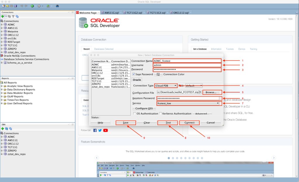 - Connection Name: The name you will like to use to easily identify this connection. For this example, we will use ADWC_fcotest
