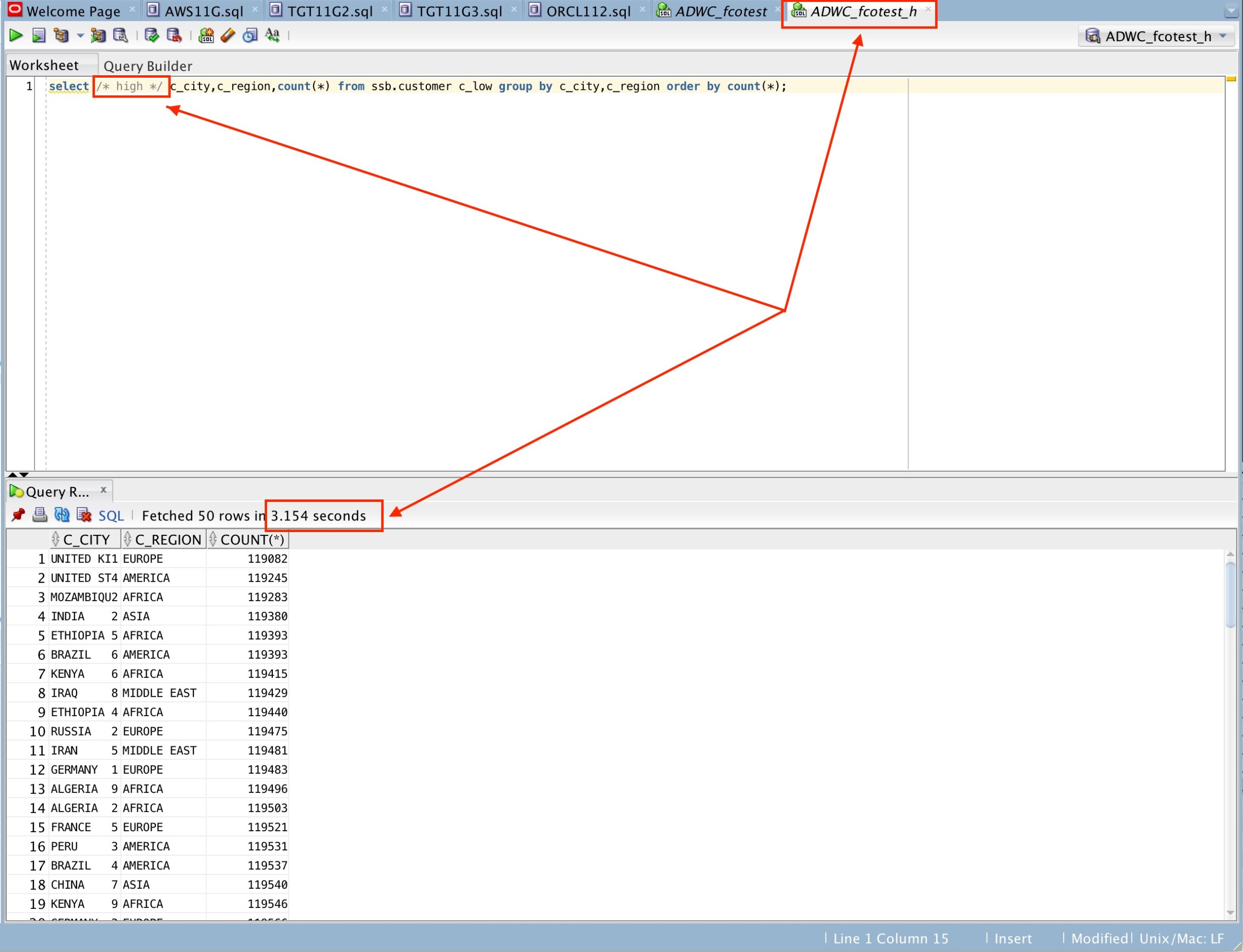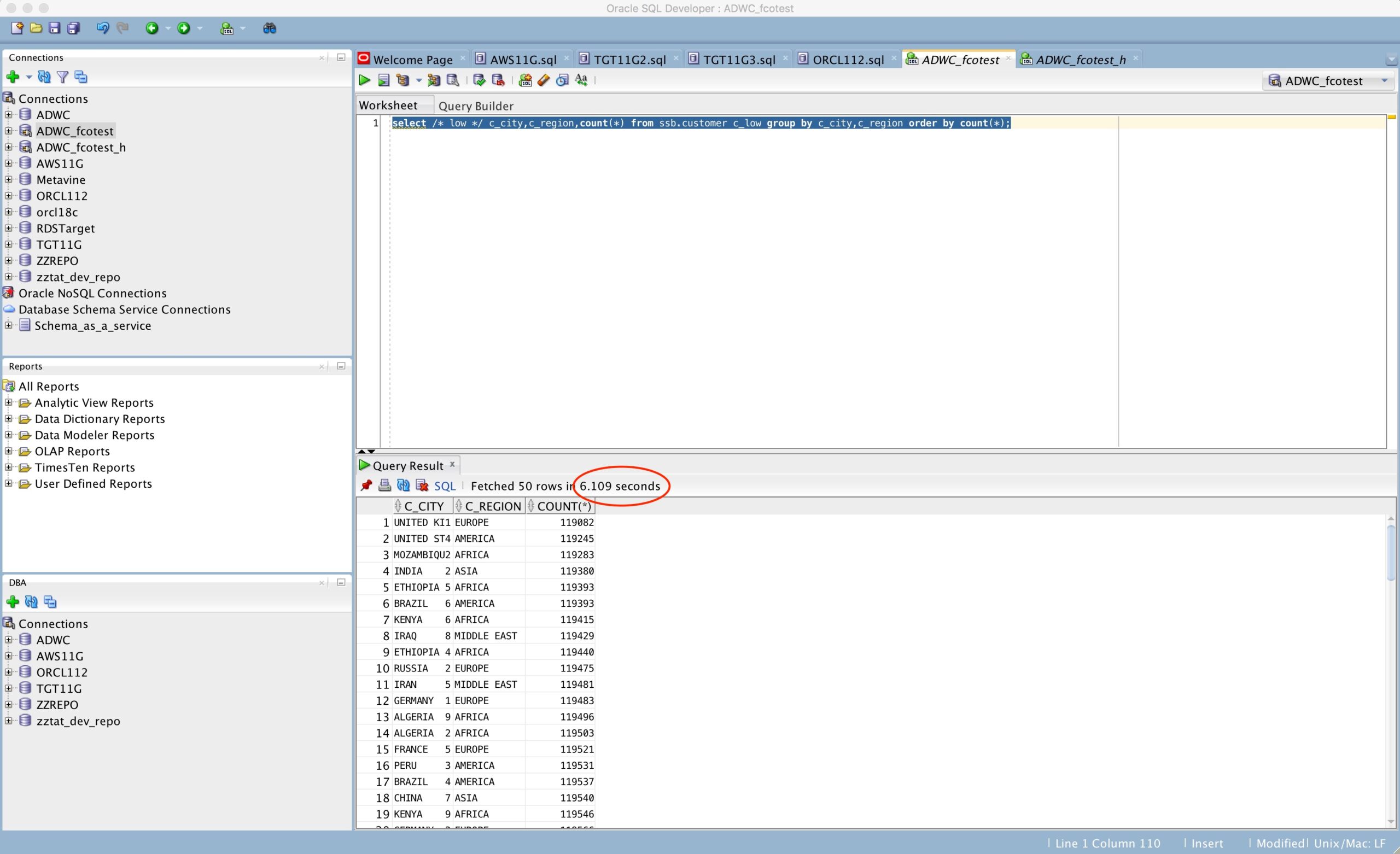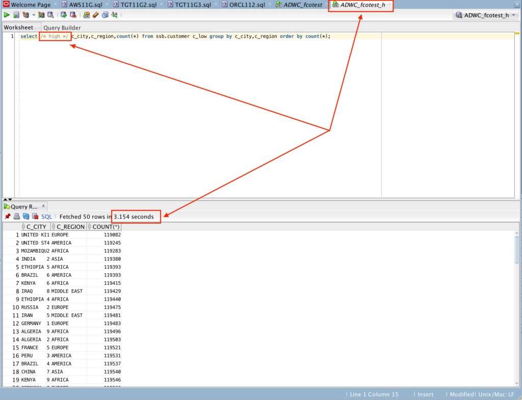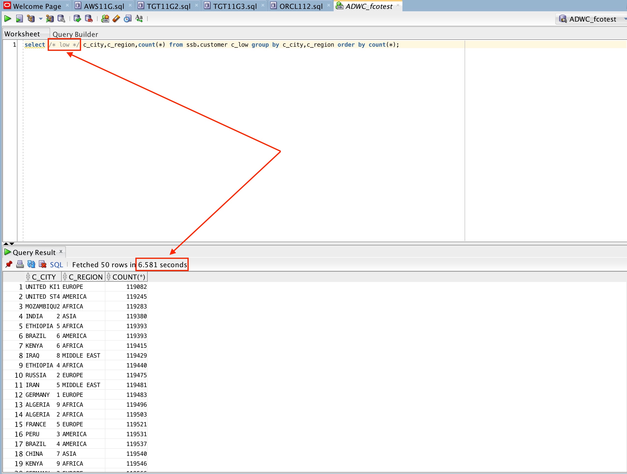 You can now see that the query using the HIGH service was executed in around 3.154 seconds, less than a half of the time required to run the same query when using the LOW service. This simple exercise showed us how the type of service used can seriously affect the performance of a query being executed against an ADWC instance.