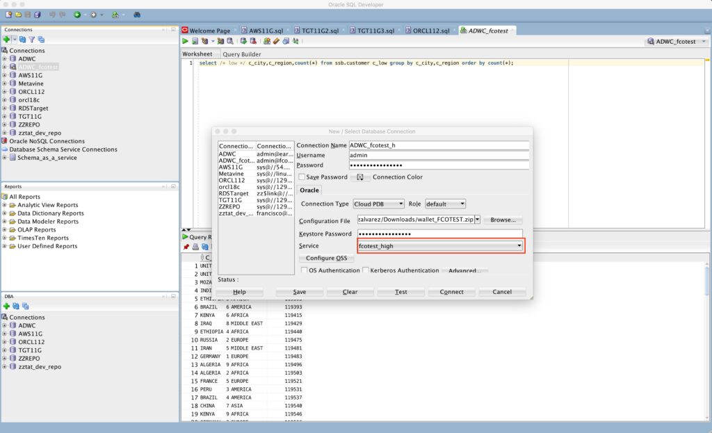 Now, to allow us to compare services performance let’s create a new connection to our ADWC instance (called ADWC_fcotest_h) following the same steps as before with the exception of selecting fcotest_high as service this time.