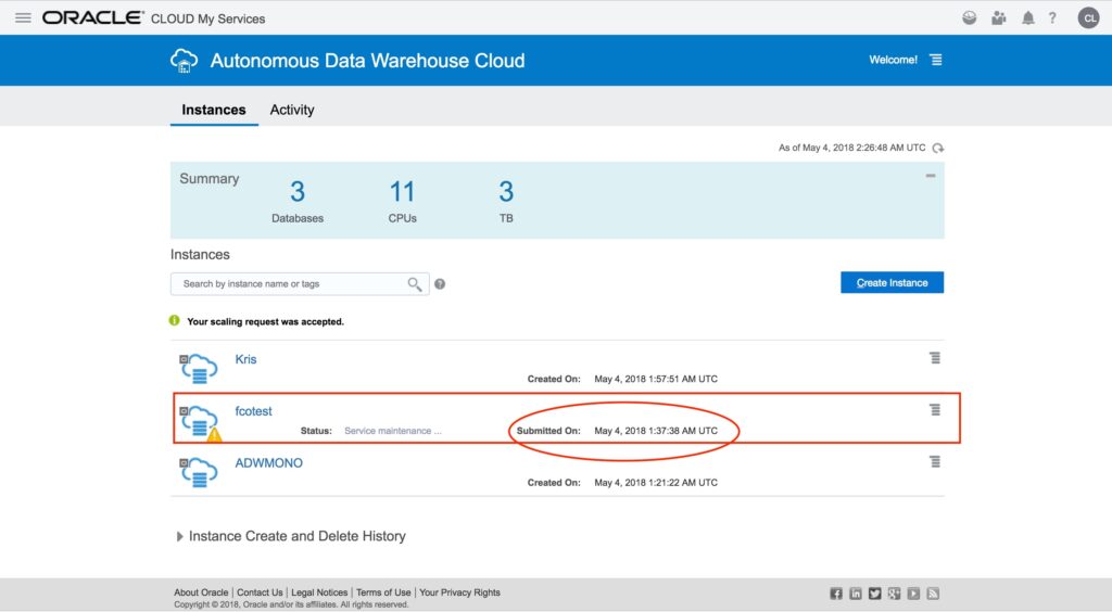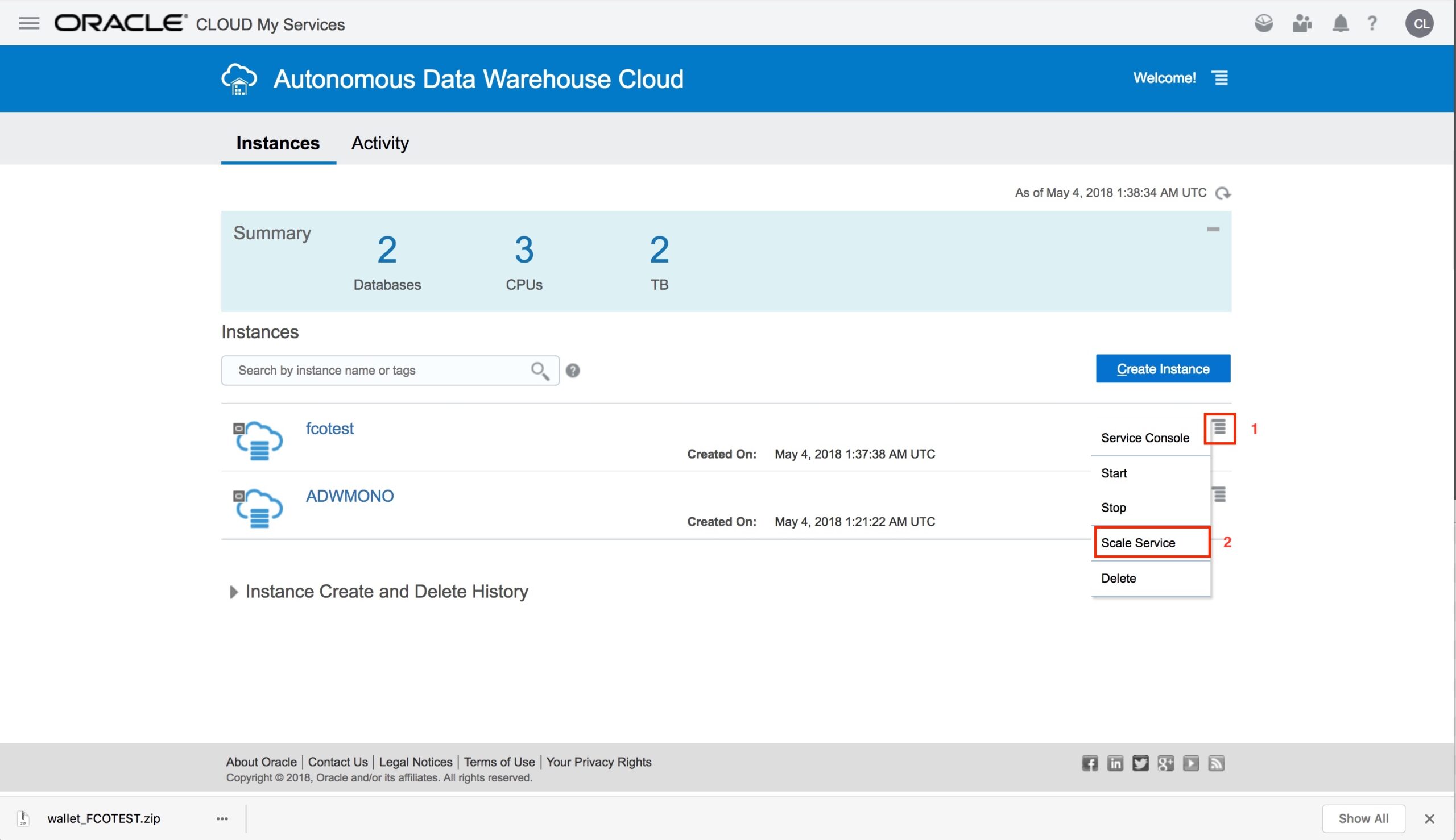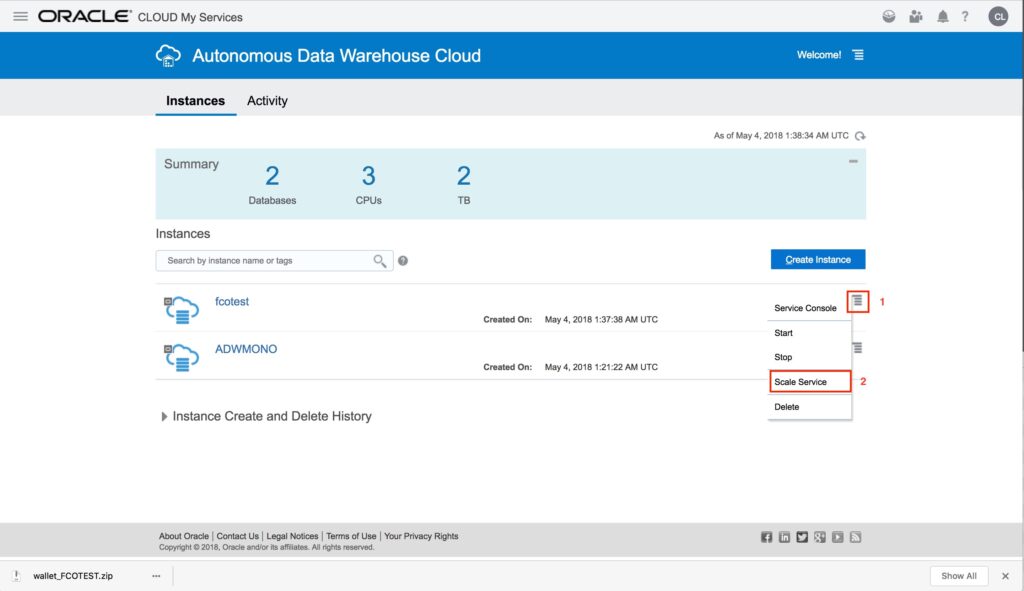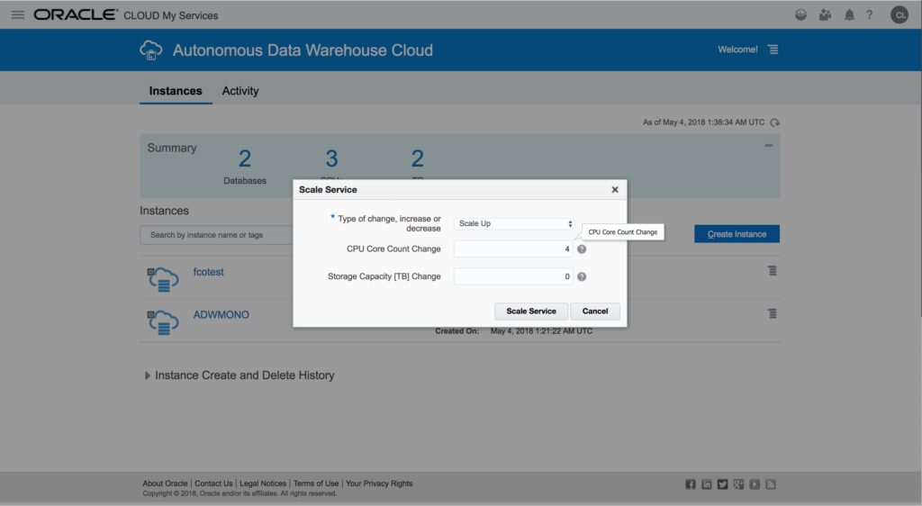 Now it is time to test another interesting feature within ADWC, the ability of scale resources (CPU and Storage) when required without any expected downtime – to bust performance when the business requires it (on demand). On the ADWC Service console click at the “fcotest” instance menu icon (as shown bellow) and select “Scale Service”