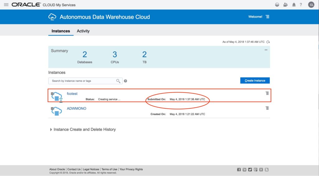 You will then see that the new instance status is now “Creating Service” and it was submitted at 1:37:38 AM UTC.