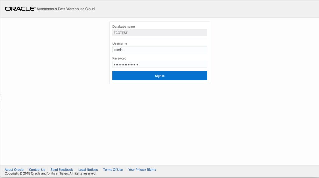 - Service: For the first example please select “fcotest_low” – by default ADWC creates 3 pre-configured service levels that can be used (<databasename_low, _medium, _high). These service levels map to the LOW, MEDIUM, and HIGH consumer groups, which provide different levels of performance and concurrency.