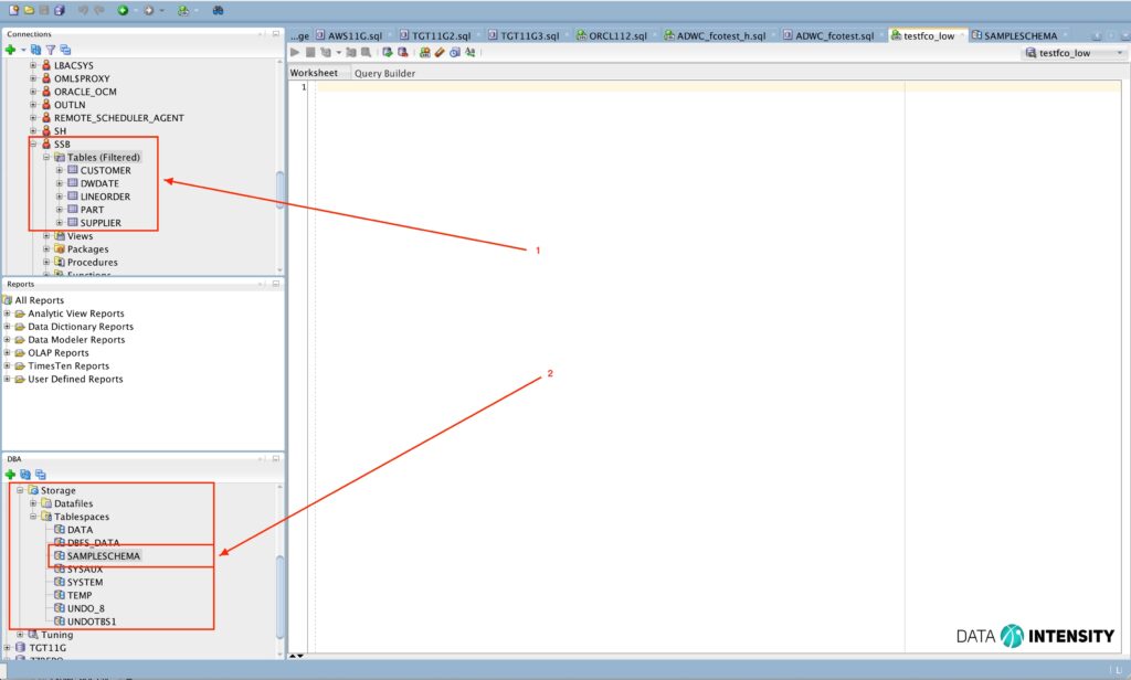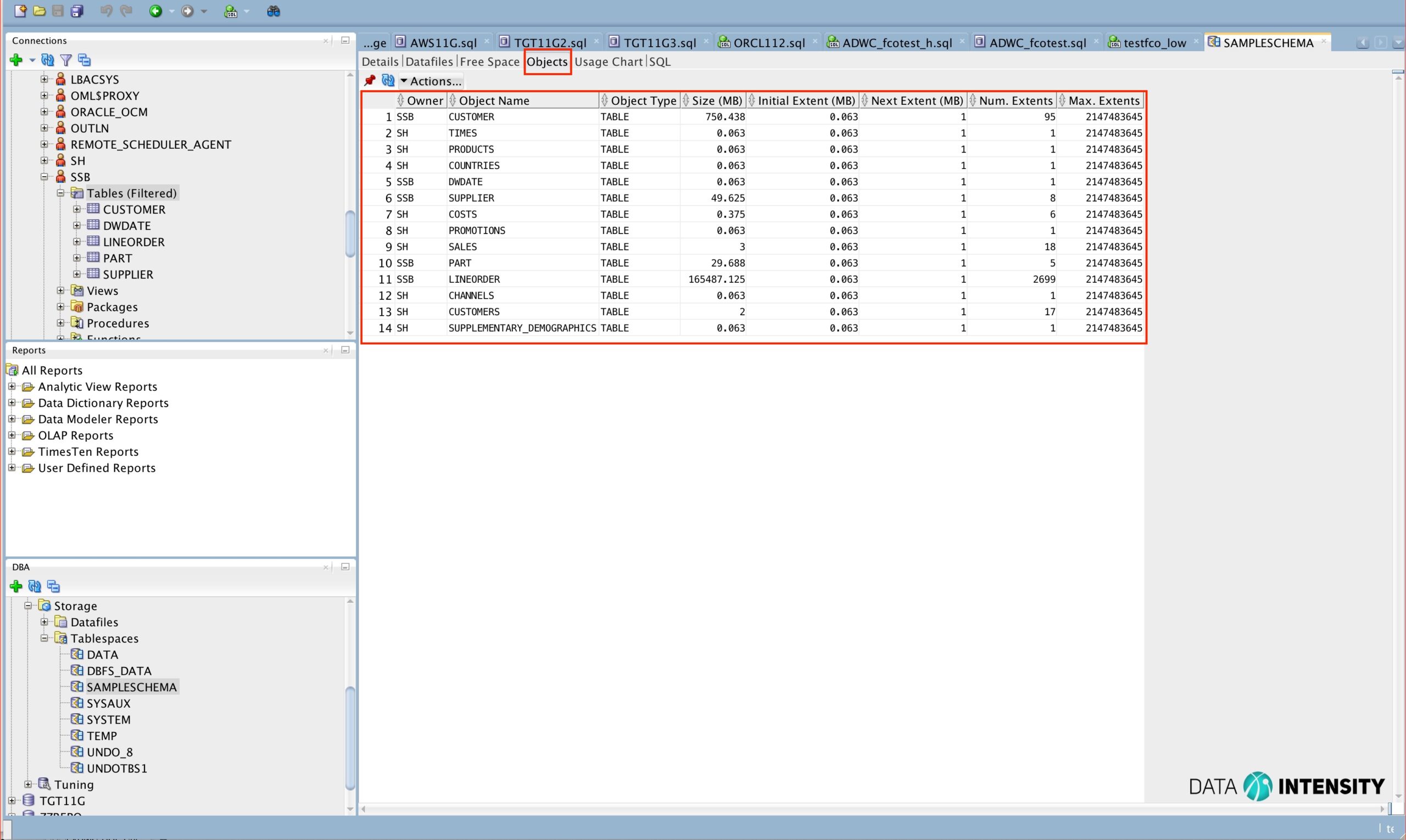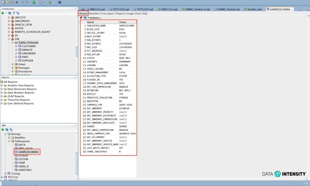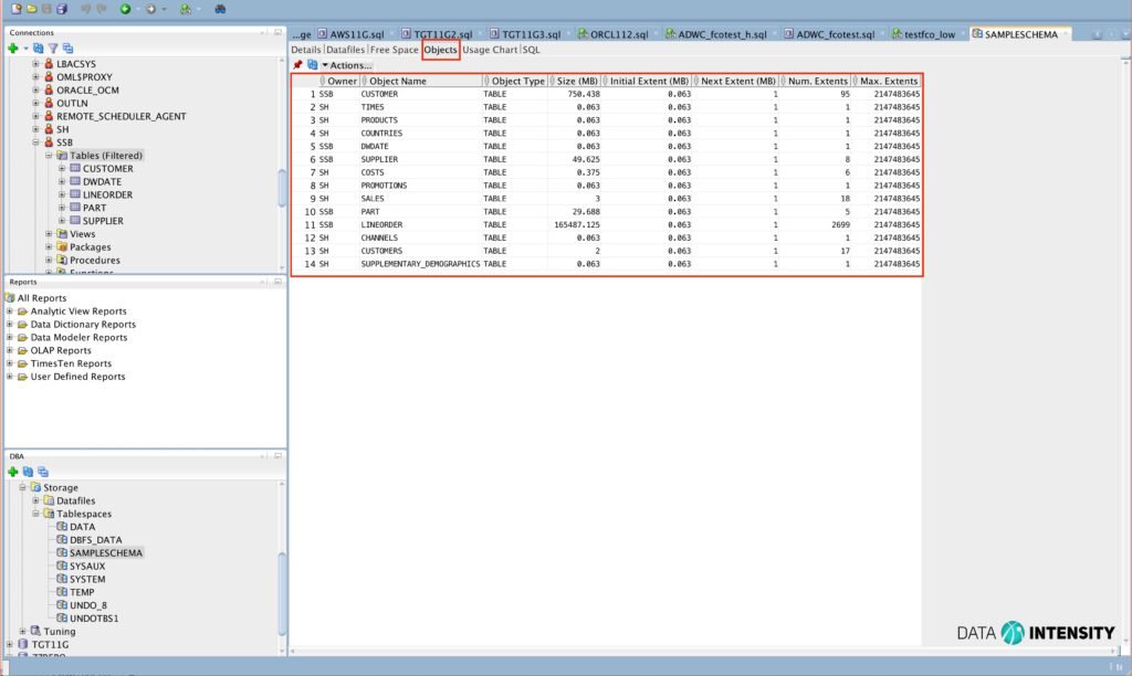 We will then go to DBA tab (2) and take a closer look at the pre loaded SAMPLESCHEMA tablespace contents.