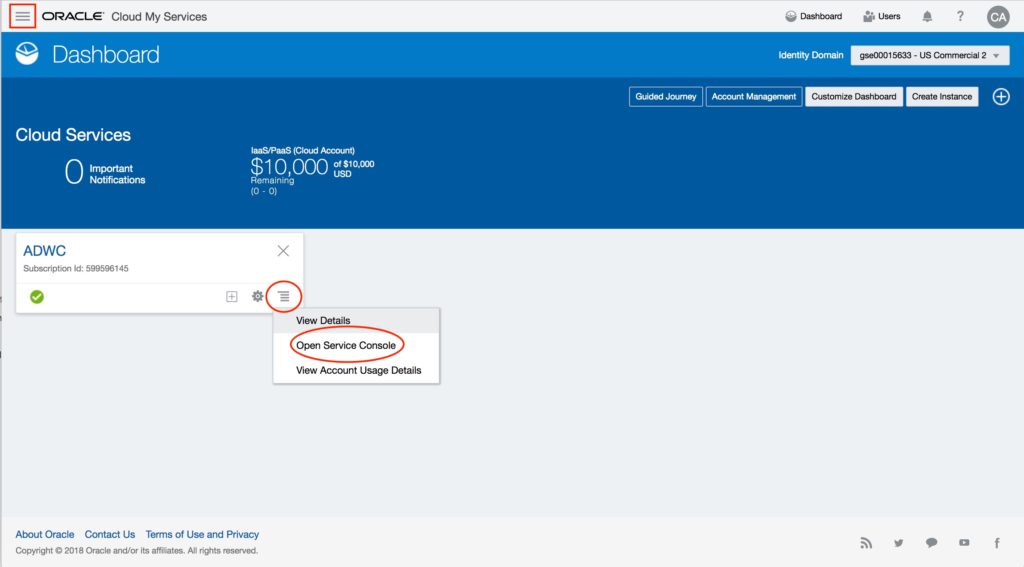 Another way to get to the ADWC Service Console is by clicking on the menu icon at the left top corner of the page then select “Services” and then “ADWC”.