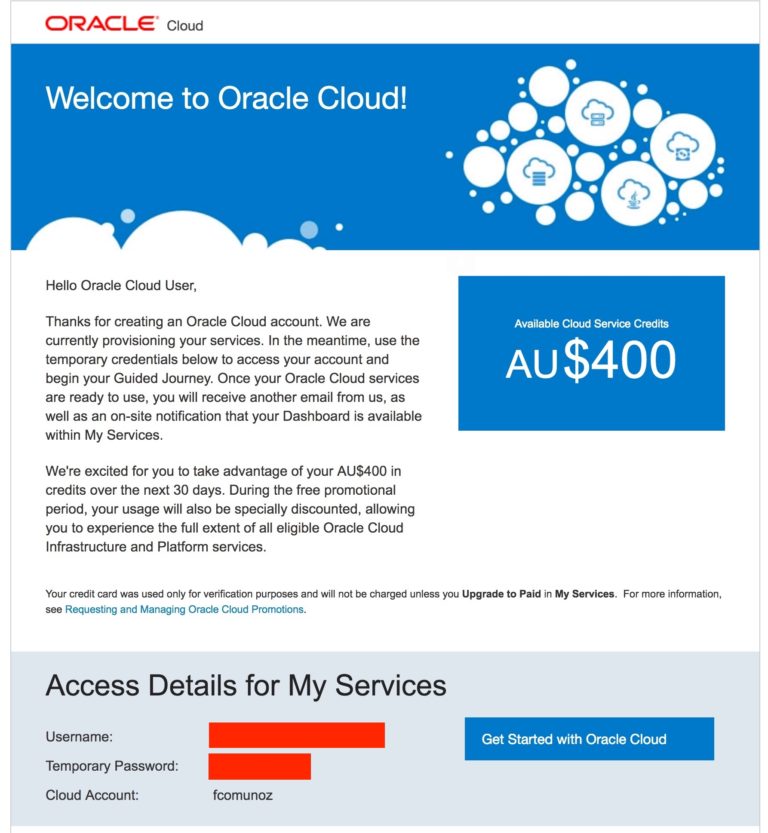 When the sign-up process is completed, you will receive an email from Oracle Cloud with your service details (Username, temporary password, Cloud Account, and link to the service).