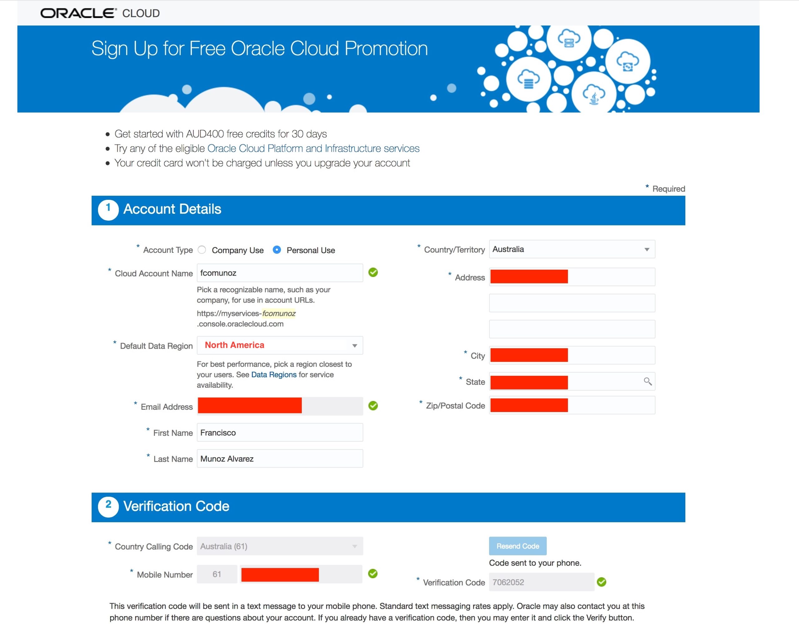 The next step would be to fill the sign-up form for the Free Oracle Cloud Promotion. When filling it is very important to select “North America” or “EMEA” for Default Data Region. This is required because ADWC is only currently available at U.S and Frankfurt (EMEA) Data Centers.