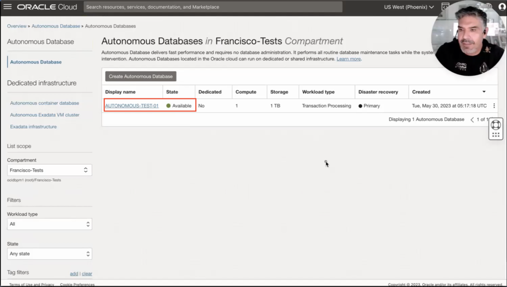 Well, we are here now, connected to OCI Generation 2. We can see that I have an Autonomous Database called “AUTONOMOUS-TEST-01” as ATP (Autonomous Transaction Processing) and it is available.