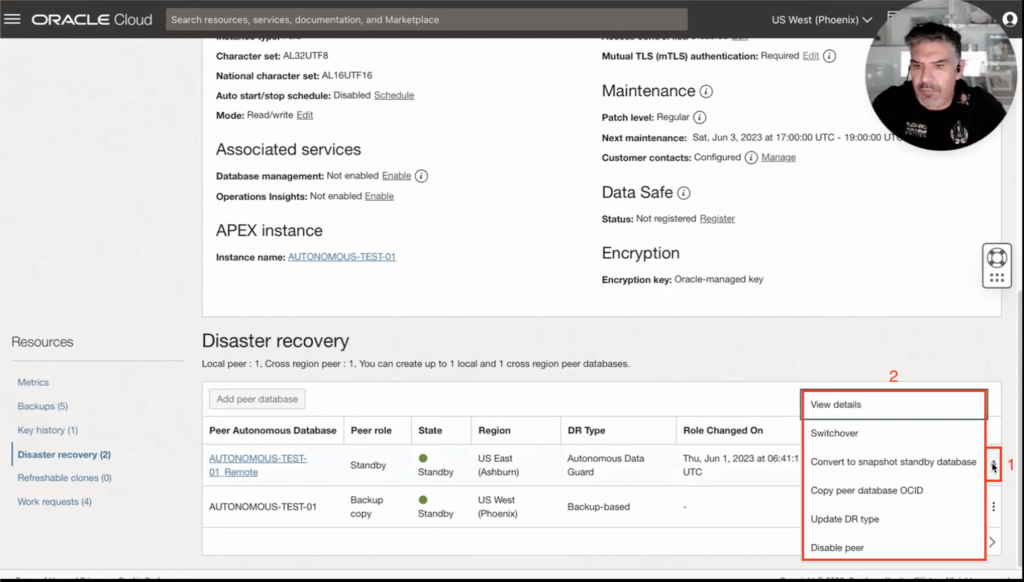 So now that I have my primary Autonomous Database protected by Autonomous Data Guard, it is time to see what I can do. For this, we will click these three buttons on the right side of my peer Autonomous Database (1). There, I can see that this menu gives me many exciting options: see the details of my Autonomous Data Guard, execute a switchover, convert my standby to a snapshot standby database, copy peer database OCID, update DR type, or disable that peer, that means this Autonomous Data Guard that I have available.