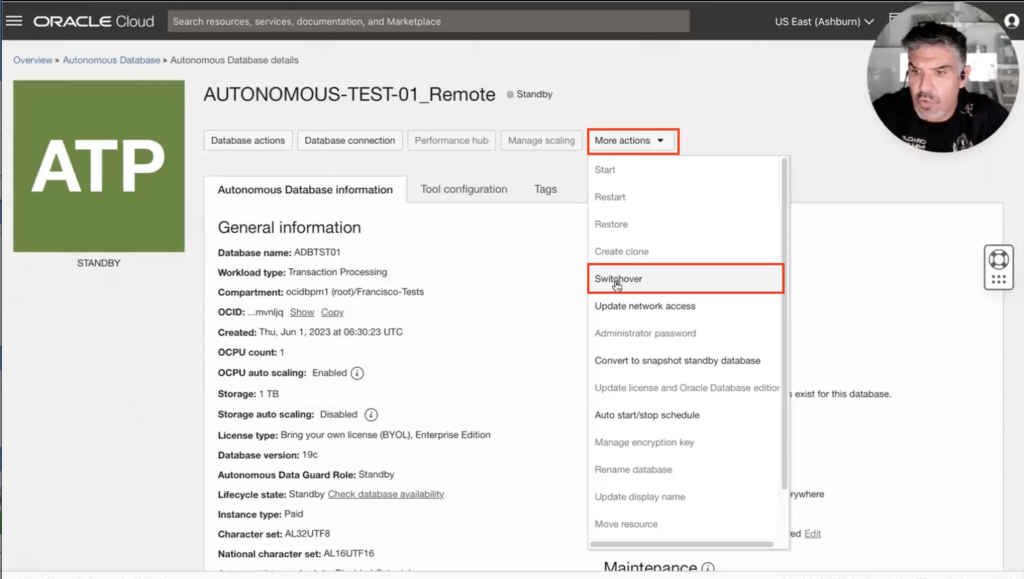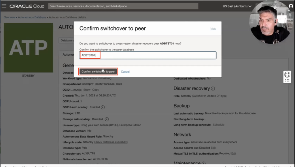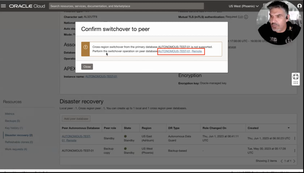 In this case, let’s try a switchover. Let’s click on the Switchover option in the previous menu. Because it is a cross-region switchover, it cannot be done from the primary database region (it is not supported), So I will then perform the Switchover by going to the region where my remote standby is (As you can see in the image below when trying to Switchover from the primary region it would give you an error message and a link to go to the peer region). So now that I clicked the link and moved to the Ashburn region, and I can see I am connected to my standby database, you must know the name of your primary database. In this case, it is “ADBTST01”.