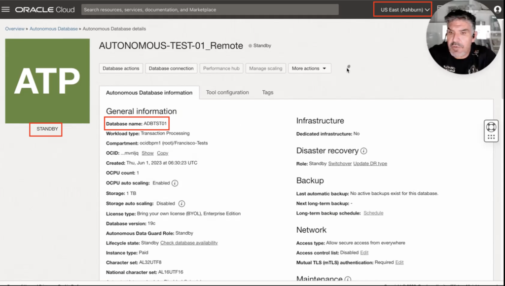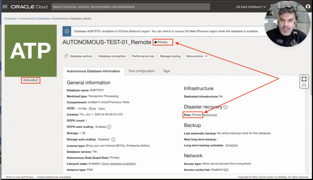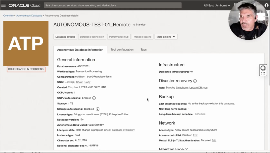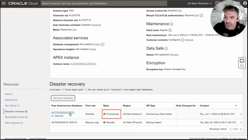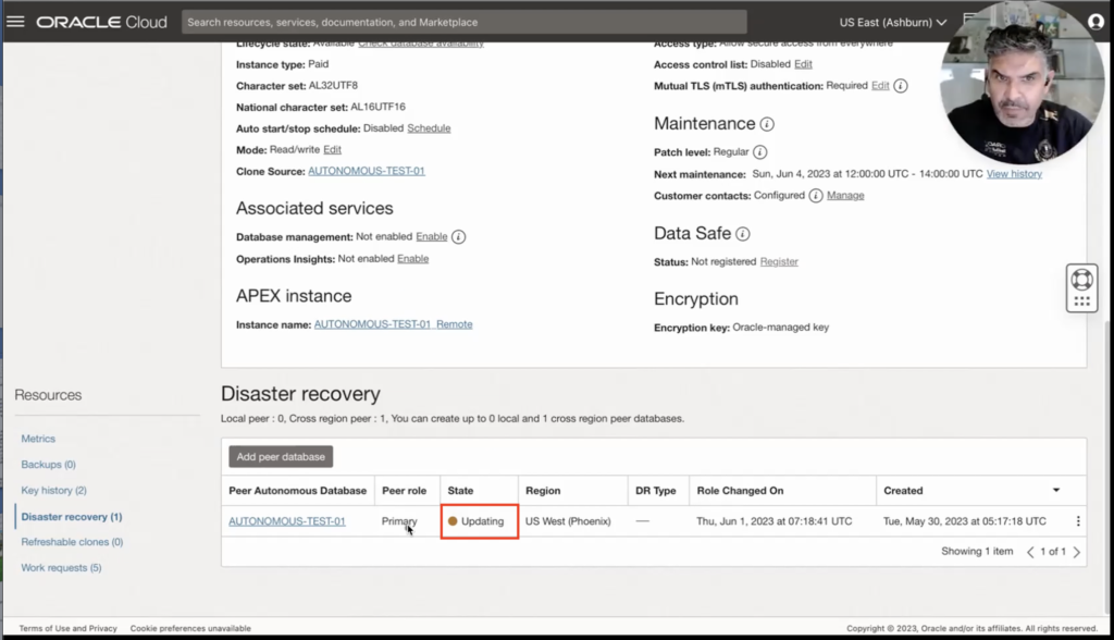Mission completed. But what about my standby database? Do I need to reprovision it? Let’s look at the Disaster recovery section of my current primary database. Wait a moment. Autonomous Data Guard has already taken care of that for me and is reviewing it.