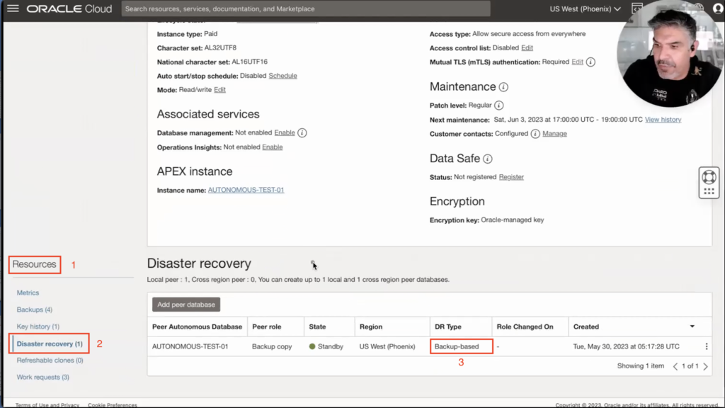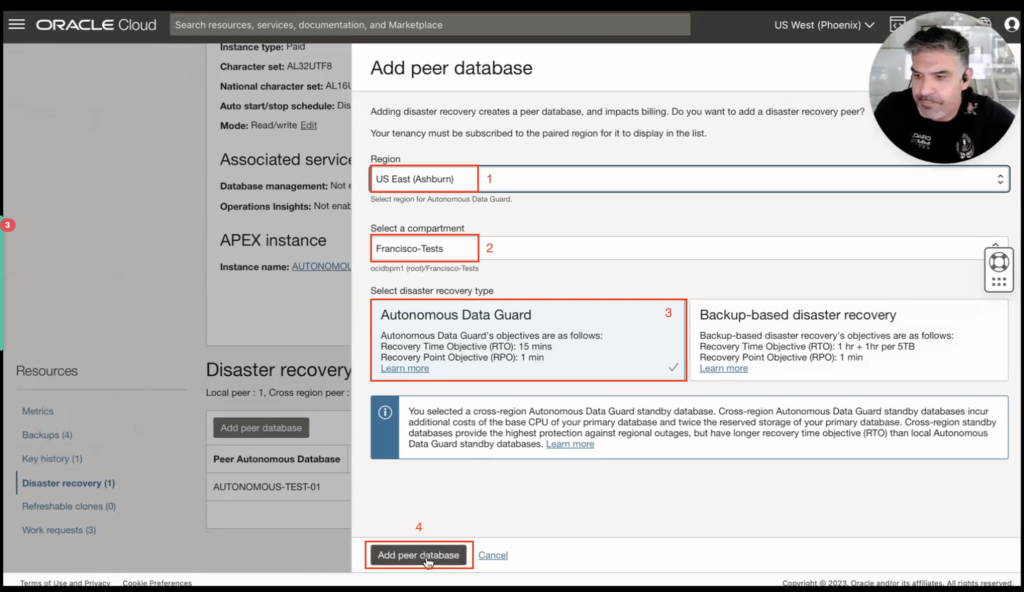 The next step would be to select the region to which we want to add the peer database; because I already have my primary on Phoenix, West Coast of the US, I will select a cross-region option like the Ashburn (1) region that is on the US East Coast as my DR site and select a compartment in the process. My compartment, in this case, is called “Francisco-test” (2), and the next step would be to select the Disaster Recovery Type I would use. I already have, by default, the Backup-based Disaster Recovery, where you can see the RTOs and RPOs I mentioned. Still, in this case, I will select an Autonomous Data Guard (3) with an RTO of 15 minutes and an RPO of one minute, and then, finally, I will click Add Peer Database (4). Now that I have that selected, I can relax and go for a coffee and enjoy it for a few minutes.