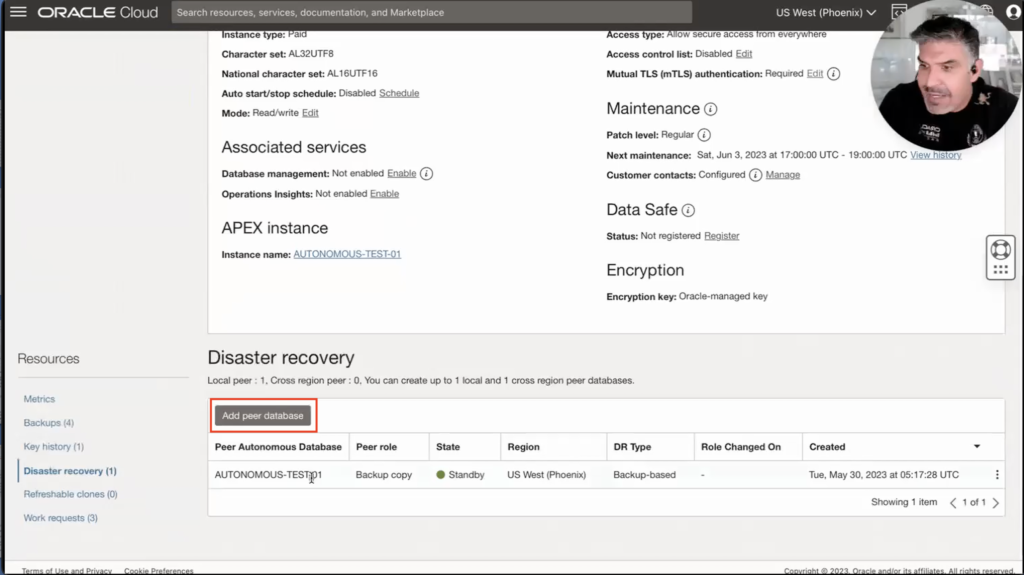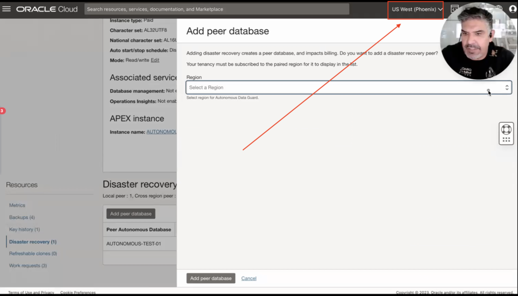 All we need to do is click on add peer database, and you will see that currently, my primary database is on the West Coast of the US (Phoenix).