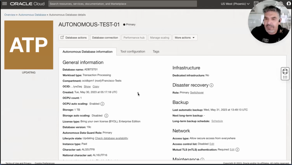 Now that my peer database is being created, I can see that the status of my ATP (Autonomous Transaction Processing) database changed to updating, and I can see that my autonomous standby database is being provisioned. That means I still have my backup as a DR strategy, but I am now provisioning my standby database with Autonomous Data Guard.