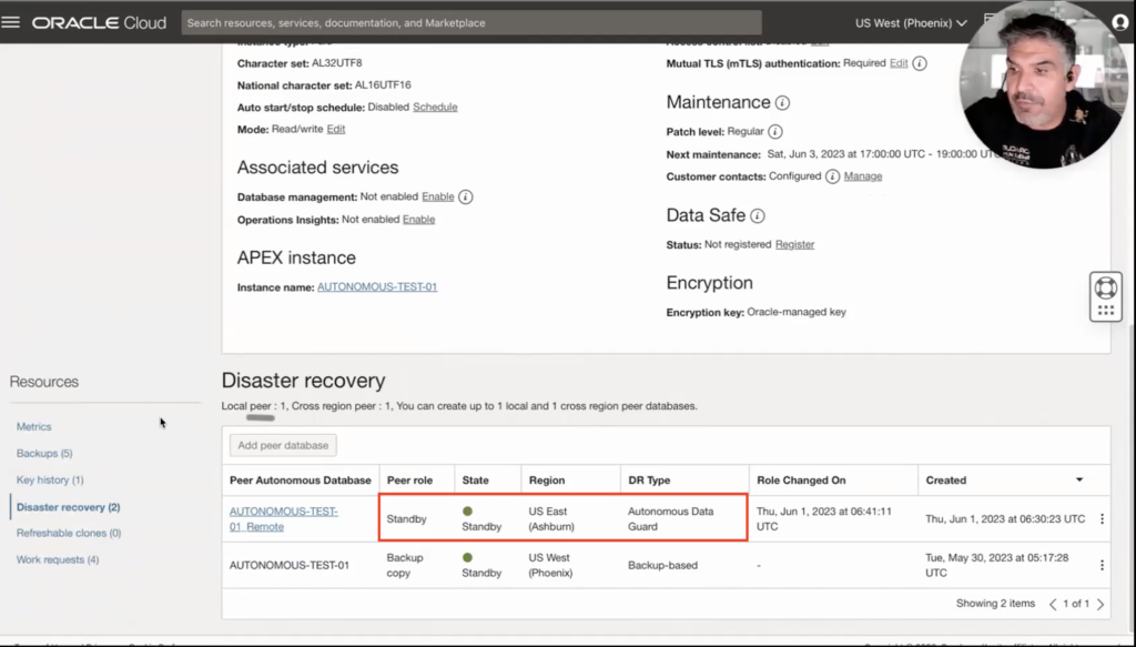 At this point, my DR environment has been fully provisioned and configured by Autonomous Data Guard, which is already providing me with the desired level of protection that I wanted as per my RTO and RPO requirements. Now, if I go to Resources and then to the Disaster Recovery section, I can see that my Autonomous Data Guard standby database is fully available