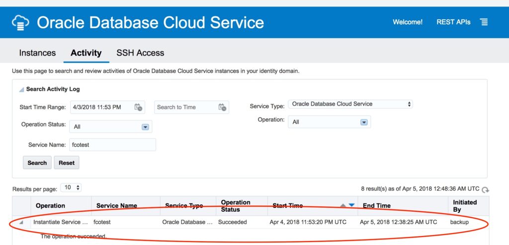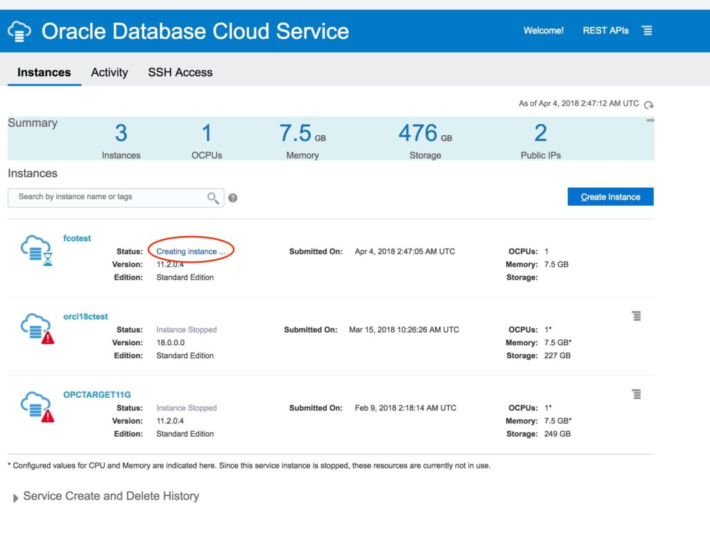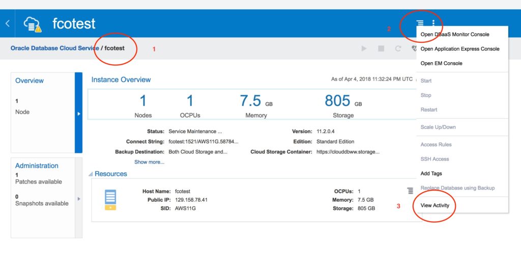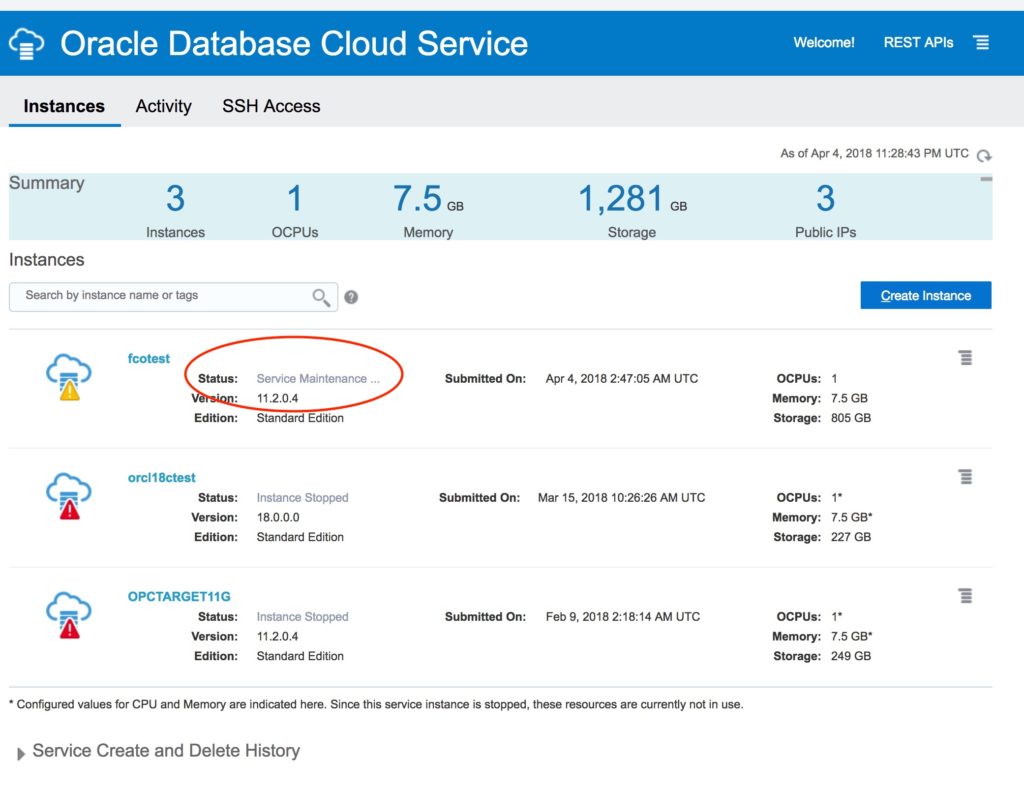 Now at the Oracle Database Cloud Service Console, you can see that the “fcotest” instance is on service maintenance and the magic is in progress.