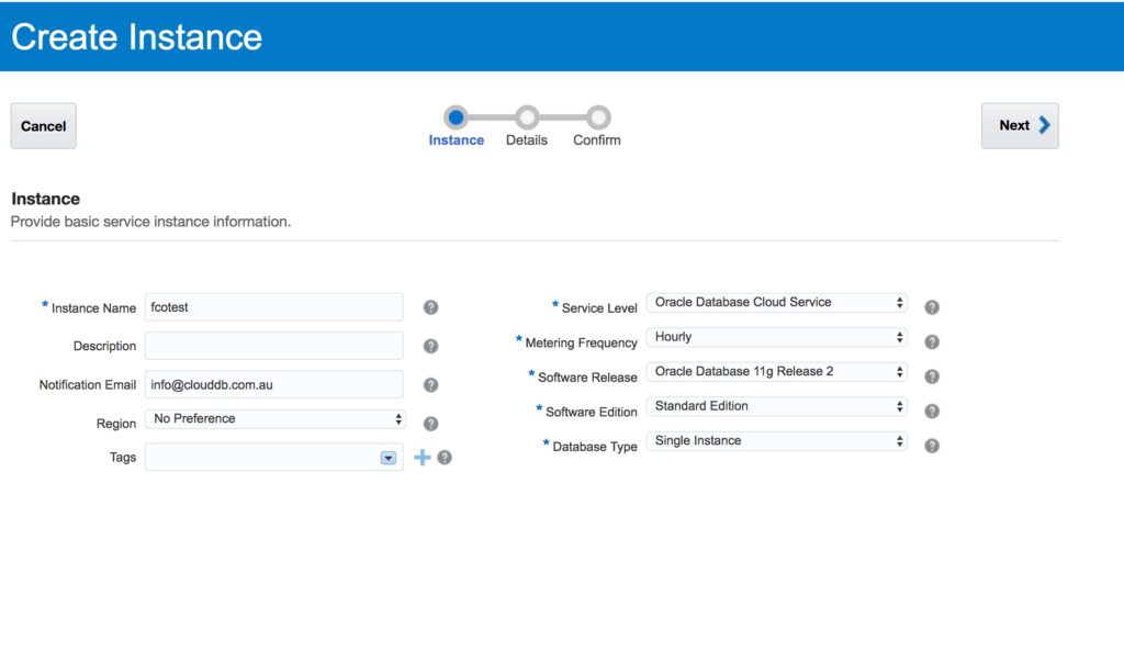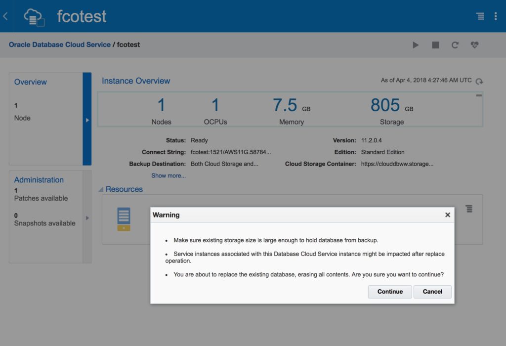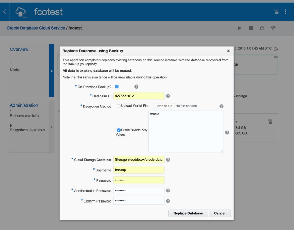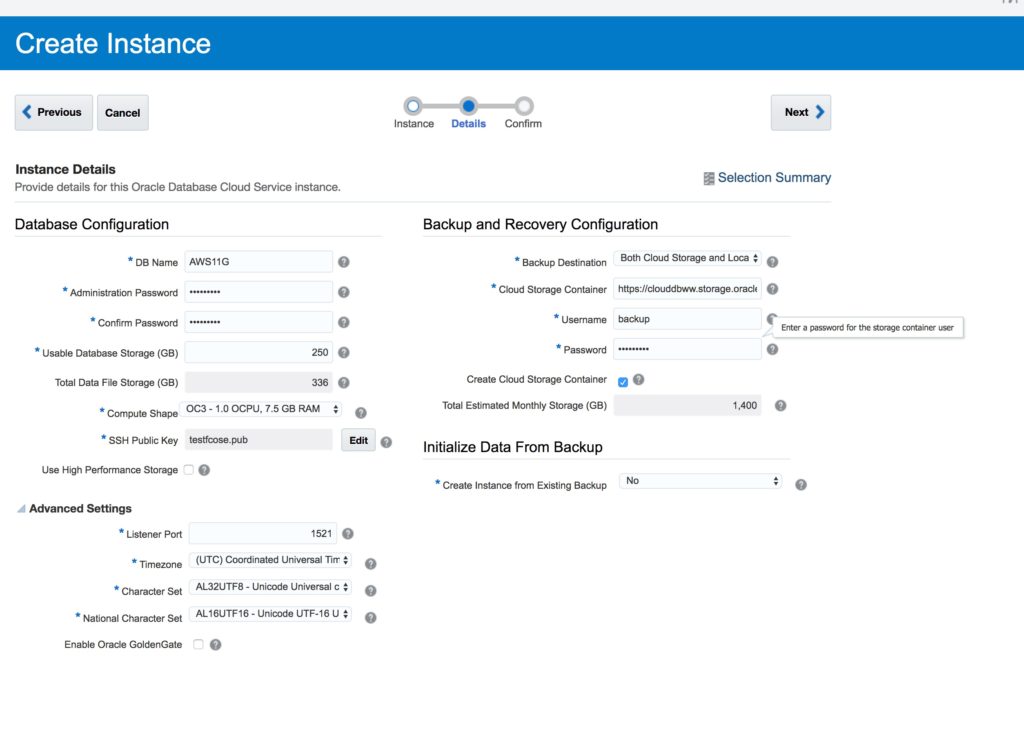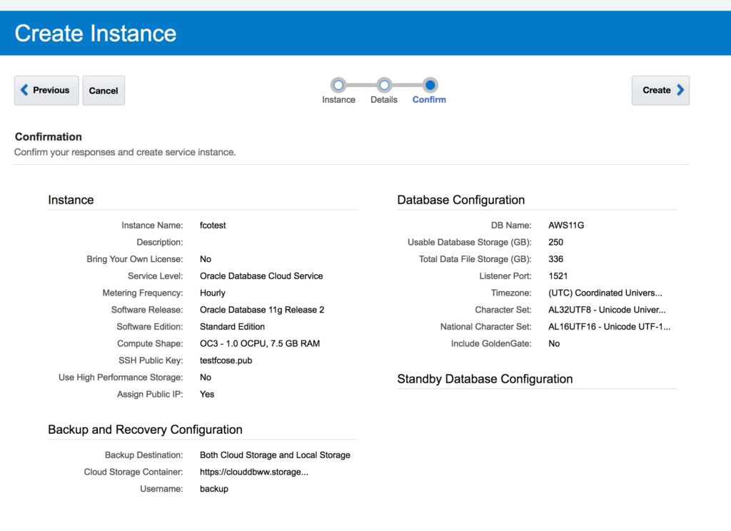 In brief, we will create a Database Cloud Service database deployment hosting a single-instance database (with the same characteristics as our source database were the backup was taken) and then afterward, replace the newly created database by using another database’s backup stored at Oracle Database Backup Cloud Service. This technique is often called “instantiate from backup” and the database from which the backup was made is called the “source database”.