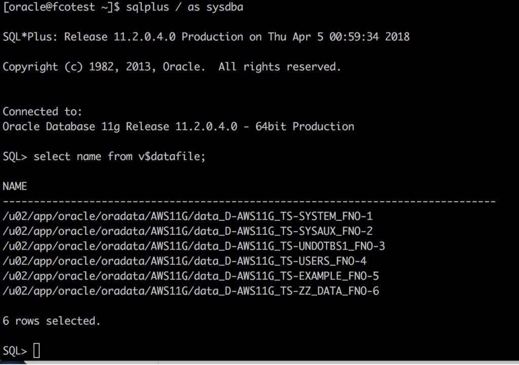 Now when connecting to the new (target) database, we can see it has the same number of datafiles as per our source database, and all our data is now there.