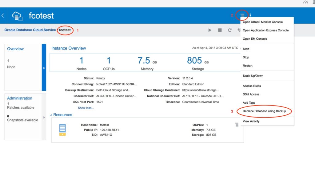 When the instance creation is completed, click on the new instance name (1), select the top right menu (2) and click on “Replace Database using Backup” (3).