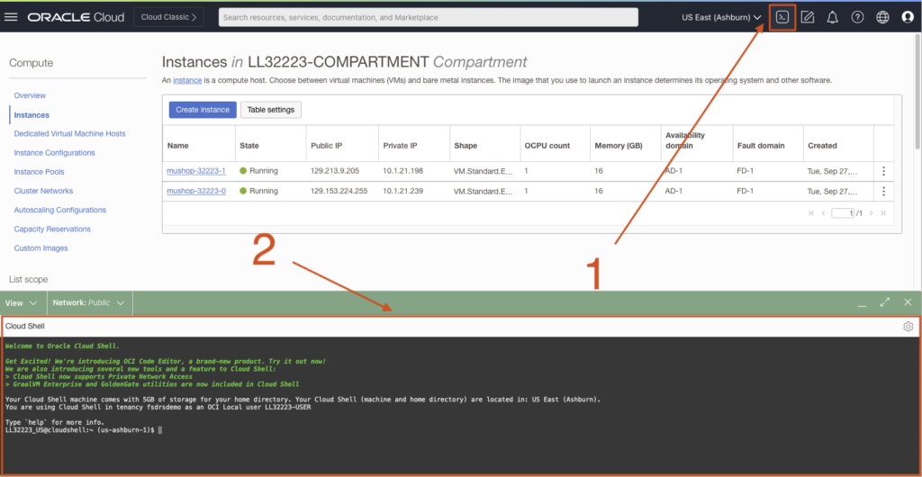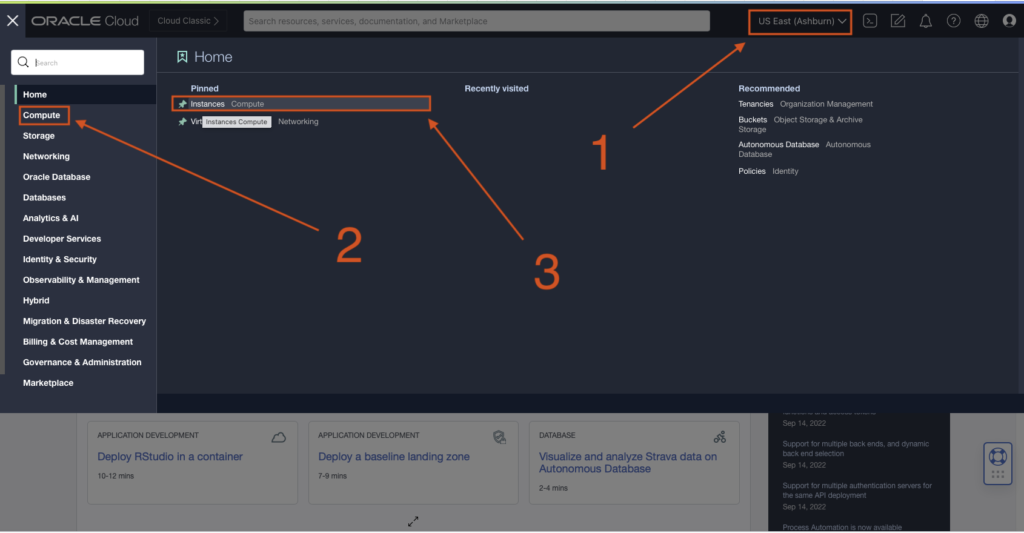Now it is time to have some fun. Let’s start by login into OCI Console to prepare the environment, first, check if the region in use is Ashburn (1), if not, please change it to Ashburn, then click at the hamburger menu at the top left corner of your screen and select Compute (2) and finally, click at Instances (3).
