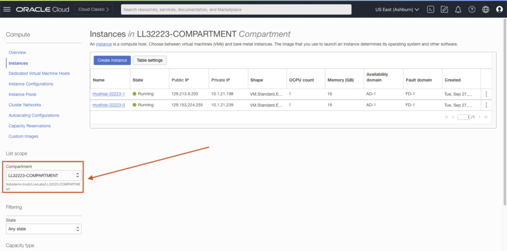 Now at the compartment tab (as per the image below) select the compartment assigned to you as per the login details page (Expand the root compartment, then click on the Livelabs compartment, and then select the compartment assigned to you). You will see the two VMs for this tutorial.