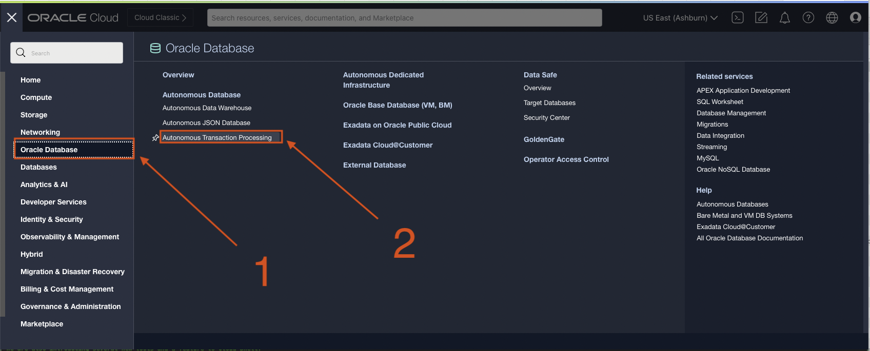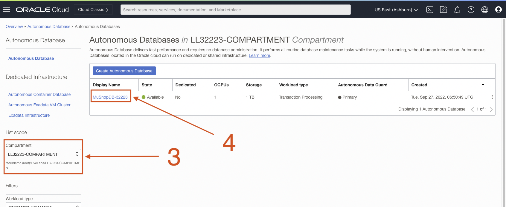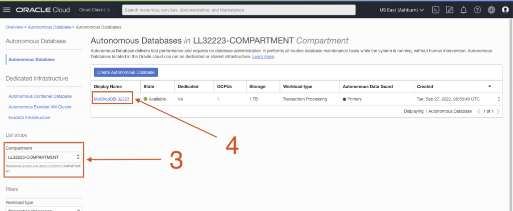The next step would be to duplicate the OCI tab in the browser, leaving the one with the Cloud Shell to be used later. In the new tab, Click on the hamburger menu on the top left corner of the screen, then select Oracle Database (1), then Autonomous Processing (ATP) (2) and remember to select the compartment assigned (3) to you and click at the display name of the Autonomous Processing Database (ATP) (4) available for you (MuShopDB-XXXX).