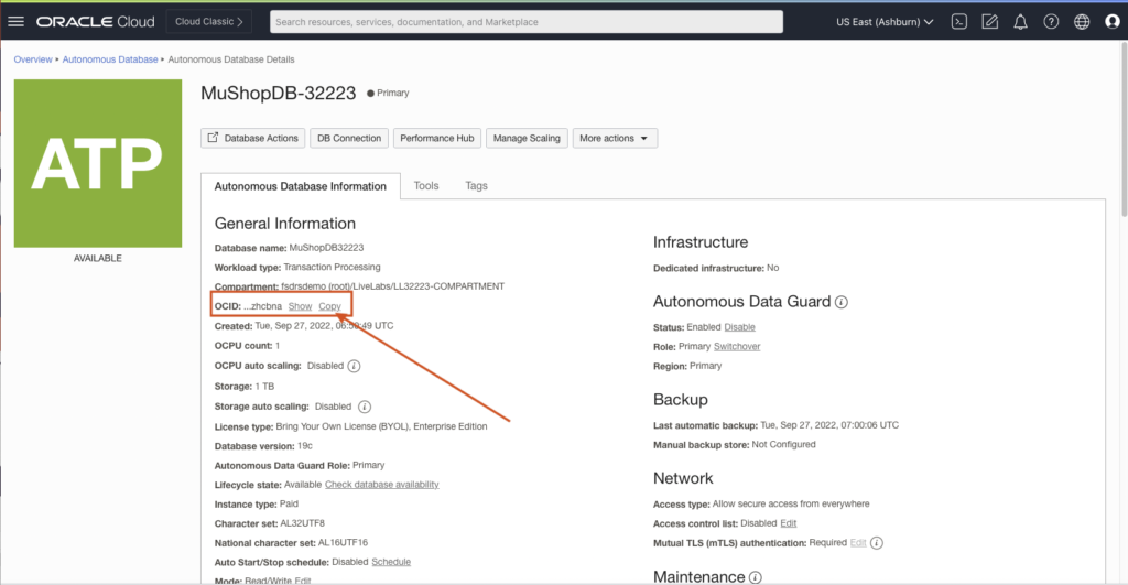 At the ATP Page, copy the OCID used at the previously opened tab with the Cloud Shell open.