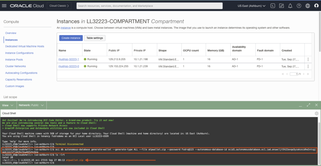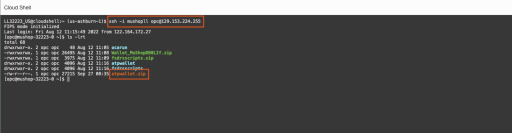 At the same Cloud Shell screen, connect to the MuShop App VM mushop-xxxxx-0, once connected, you should be able to see the atpwallet.zip file that was previously copied via scp.