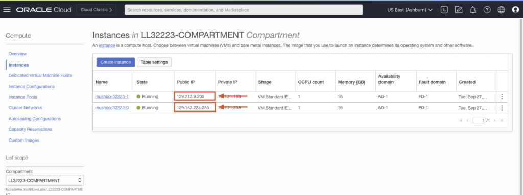 Now we need to move to the other tab we have open and click the hamburger menu, select Compute, then Instances, and gather the Public IPs of the two MuShop application instances.