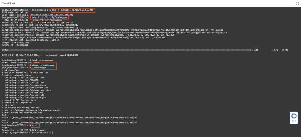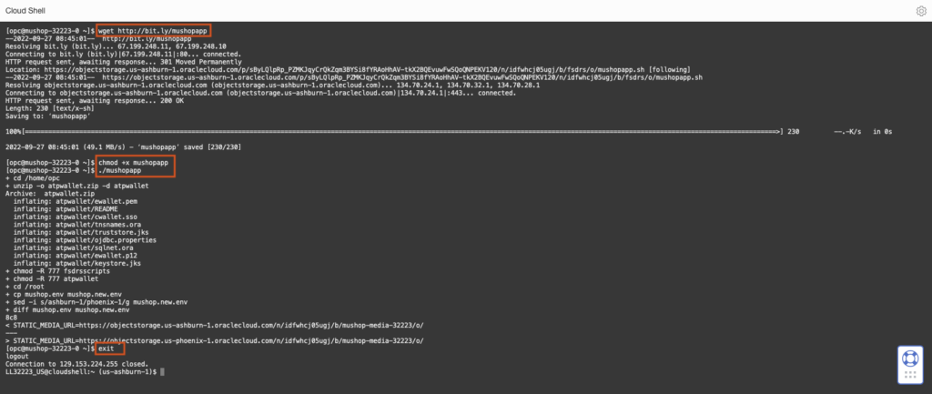 We will move again to the tab with the Cloud Shell open and Scp (Secure Copy) the ATP Wallet to the MuShop Application compute instances (both IPs).