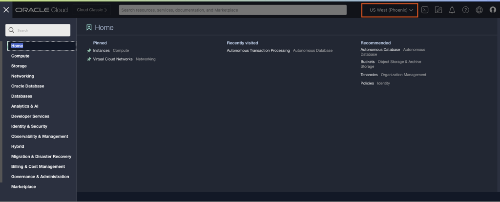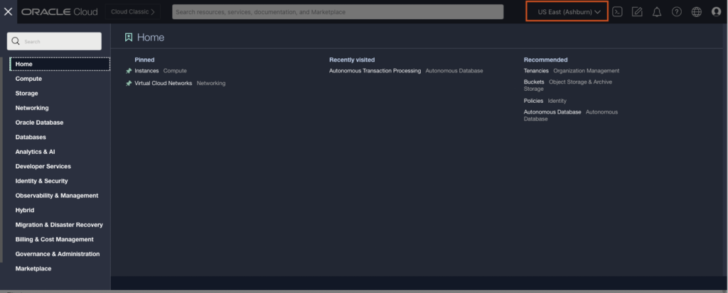 For this exercise, we will need to open another 2 tabs within OCI and have one connected to the Ashburn region (Primary) and the other to the Phoenix region (the standby).
