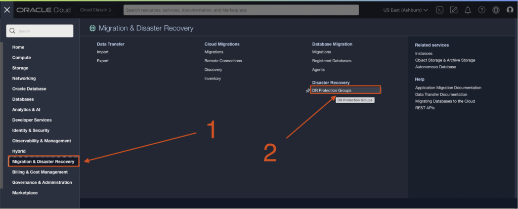 Let’s connect to the tab within the Ashburn region and click on the hamburger menu at the top left corner of the screen, then select the Migration and Disaster Recovery option (1), then Disaster Recovery -> DR Protection Groups (2).