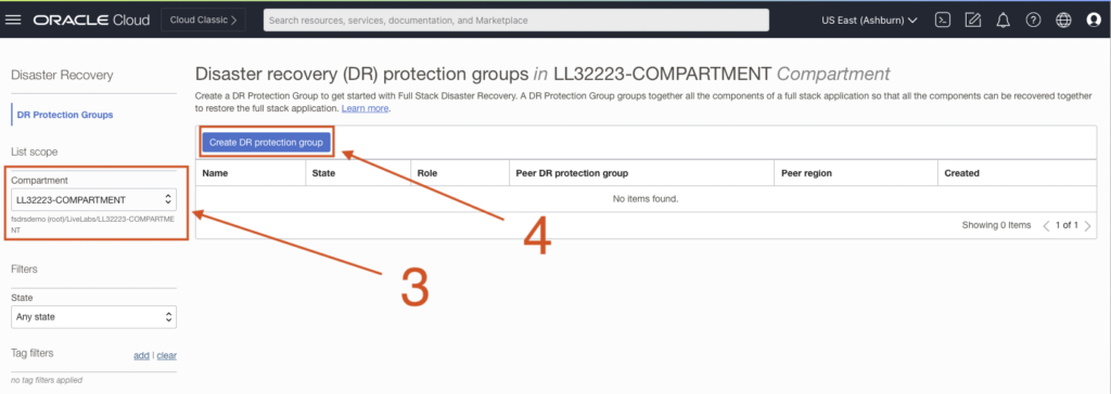 At the DRPG page, ensure you are at your correct compartment (3) and click on “Create DR protection group” (4).