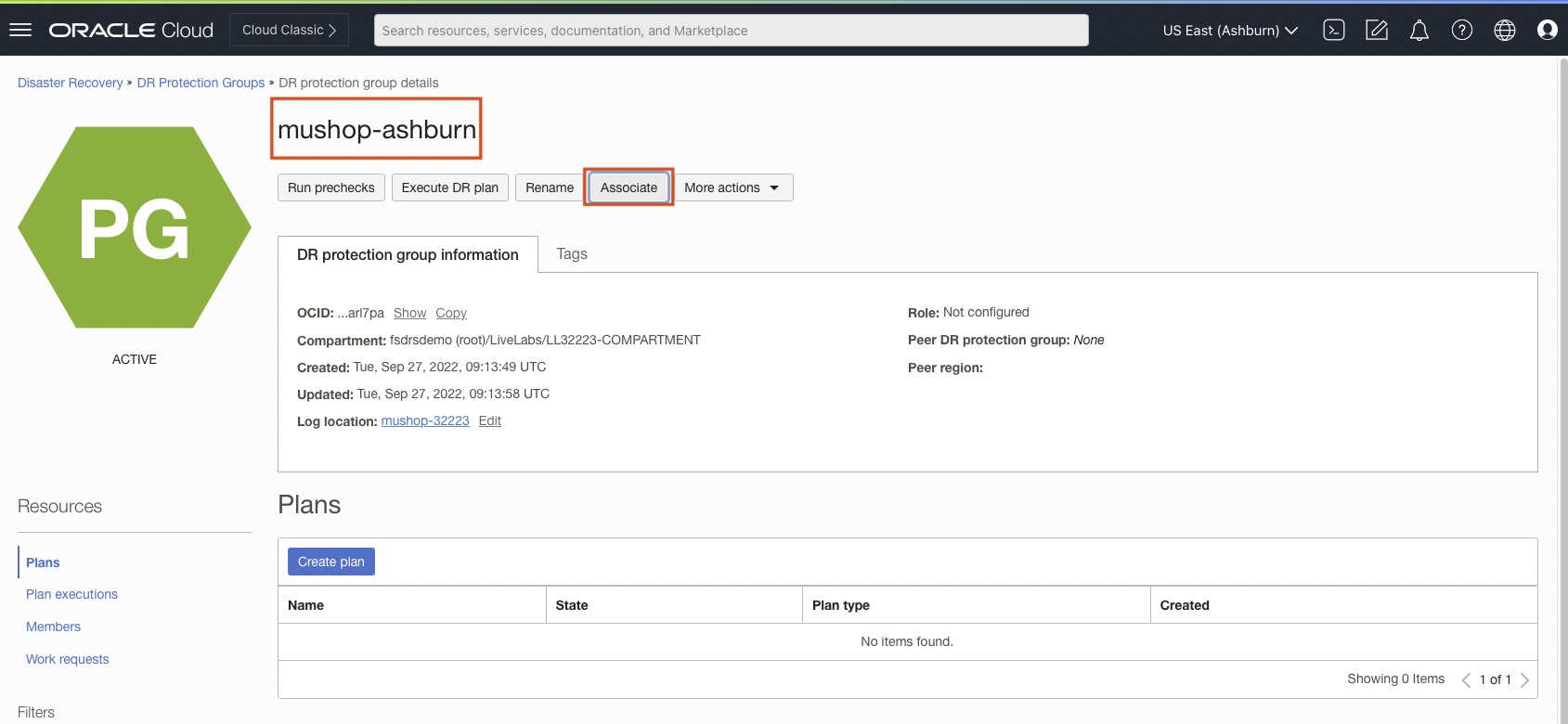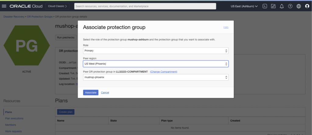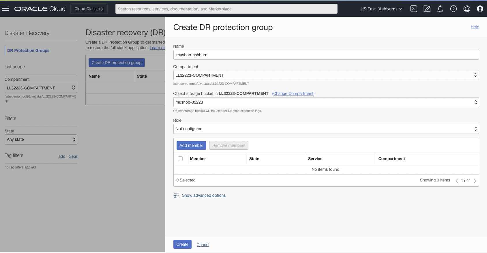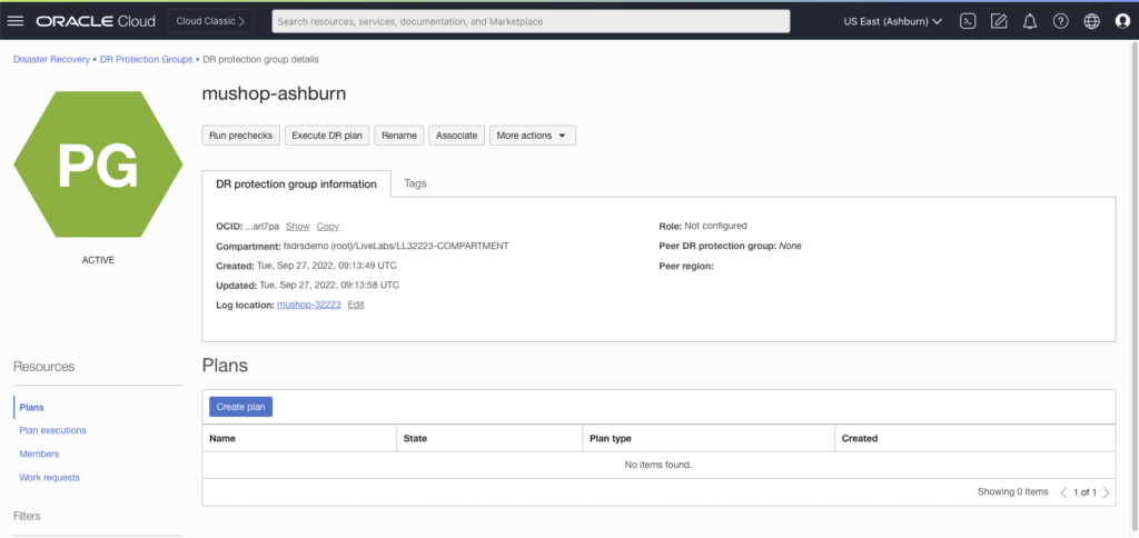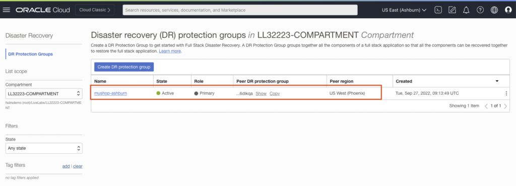 - Create DRPG in the Ashburn region. Select Create DR Protection group in the Ashburn region browser tab and follow the below instructions.