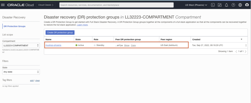 Now is time to connect to the other tab we have open connected to the Phoenix region and repeat all previous steps to create a DRPG but change the DRPG name to “mushop-phoenix” as below: