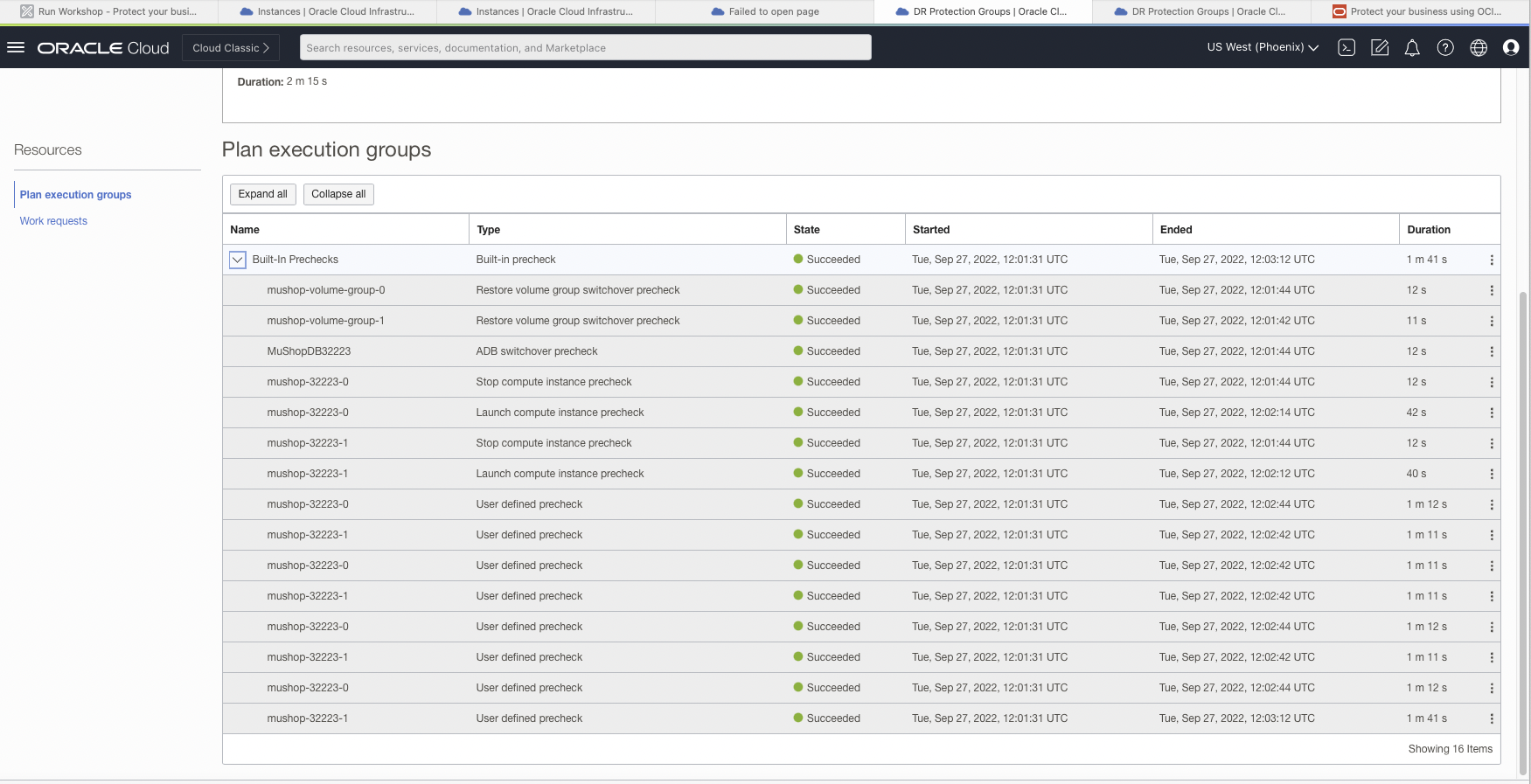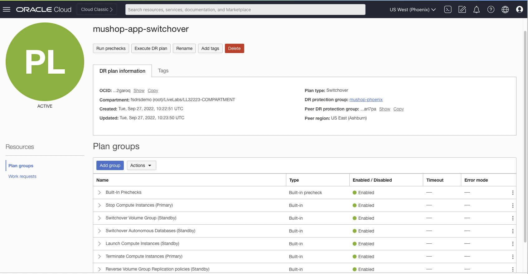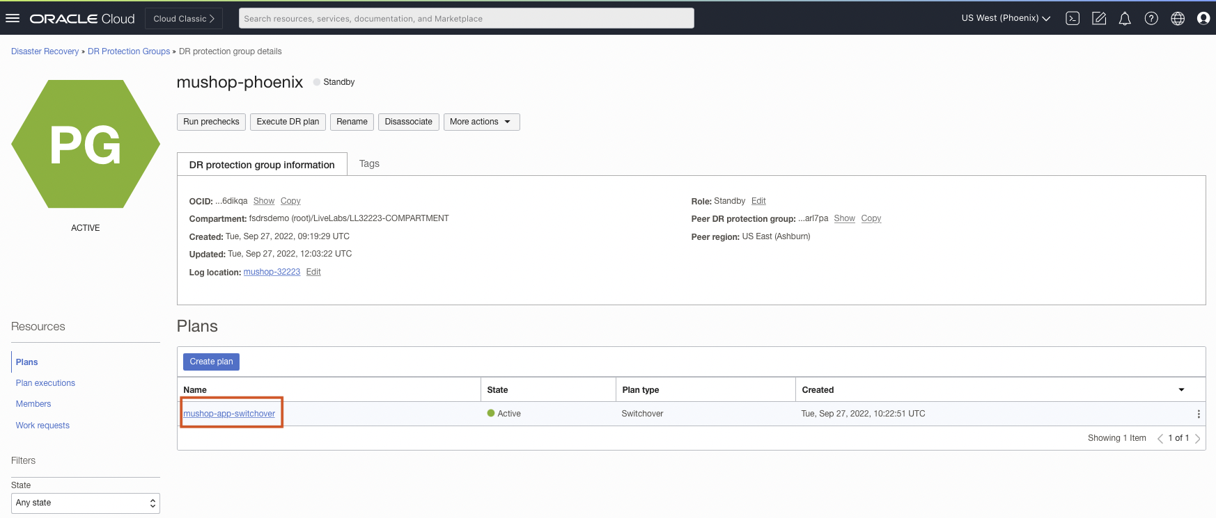 You will land on the Disaster Recovery Protection group home page; make sure you have selected the Phoenix region.Select the mushop-phoenix DRPG and select mushop-app-switchover plan.