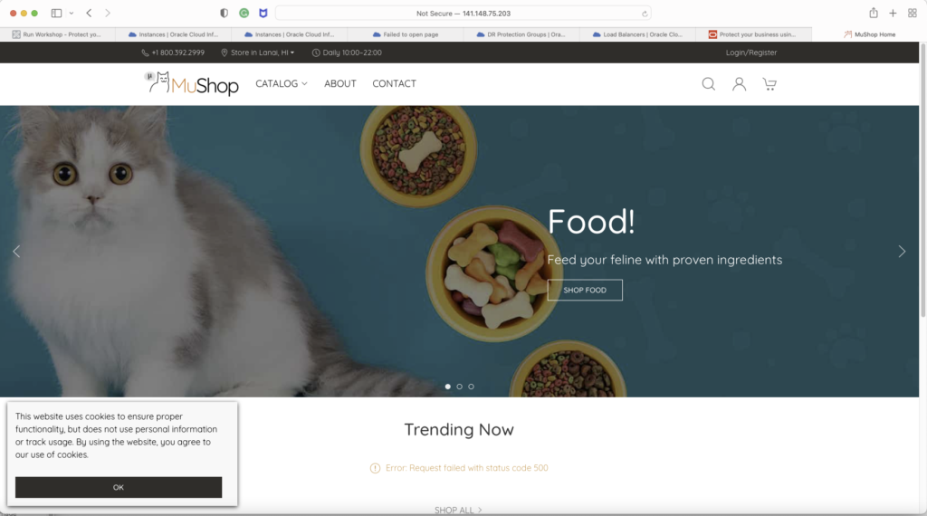- Open a tab in your browser and verify the Mushop Application using the gathered public IP address. You should be able to see that the application is working as expected from the Phoenix region.