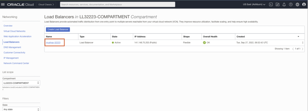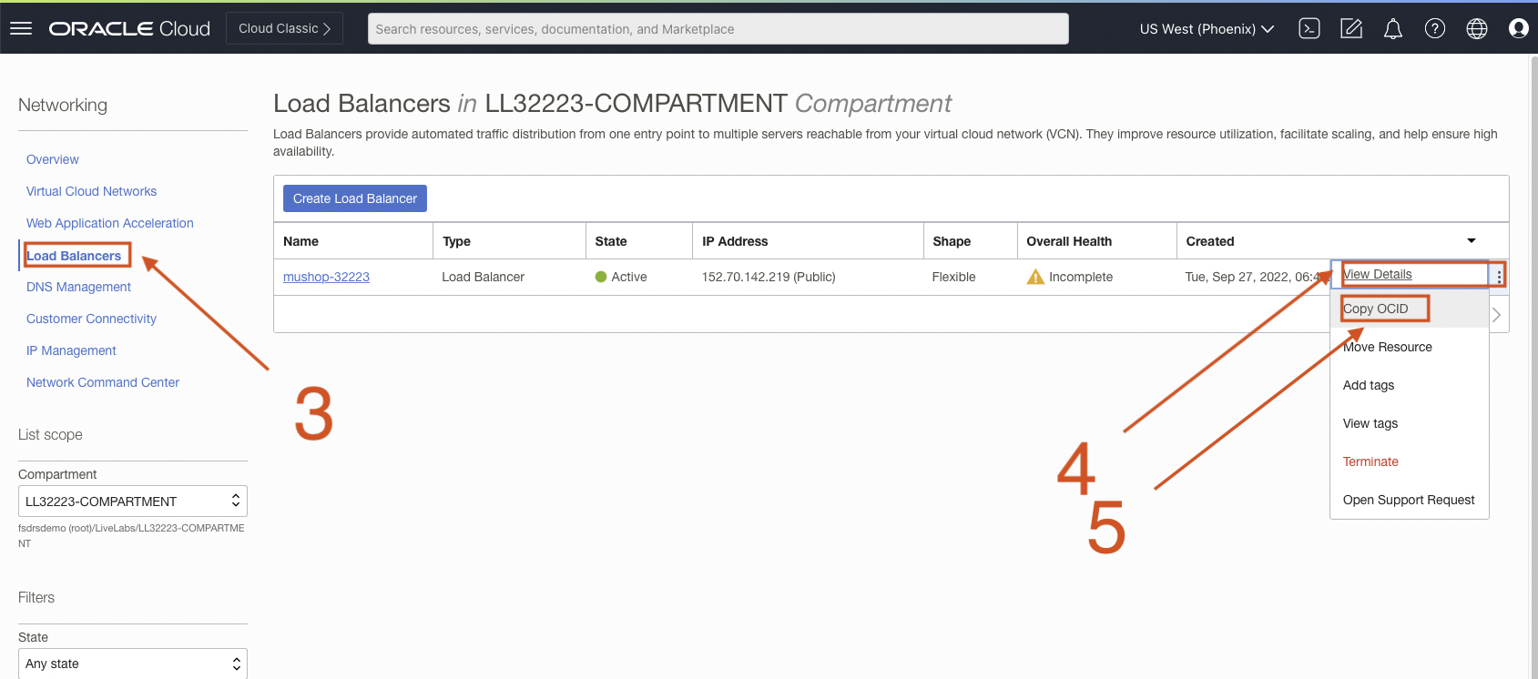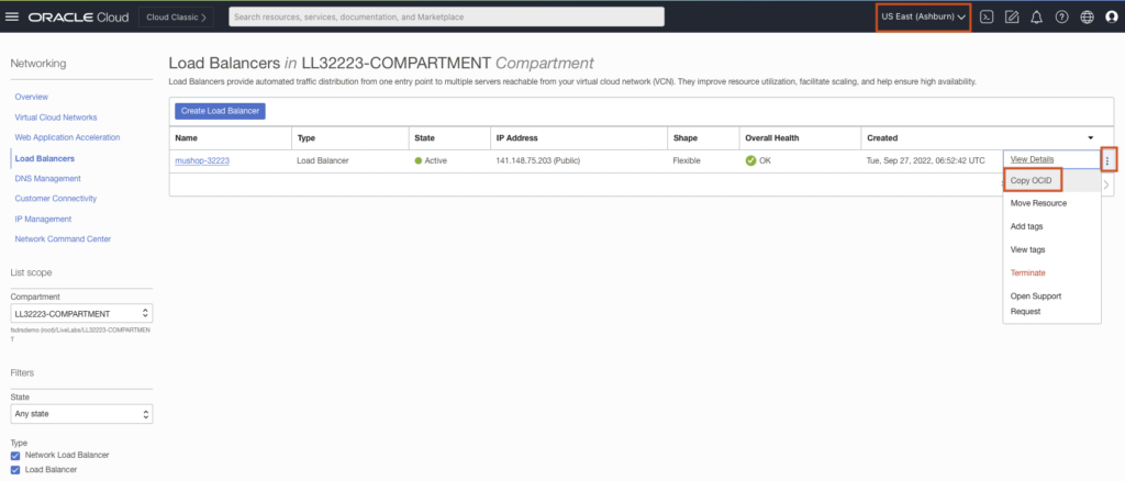 You will see that you have a load balancer with the name mushop-xxxx; choose the right compartment assigned to you. Select the three (4) dots on the right end of the load balancer details. Select Copy OCID (5) and paste the OCID details safely into any preferred notes. You should have something similar to below