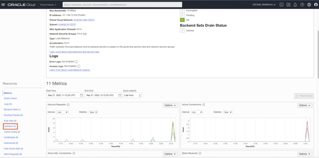 Let us break the MuShop Application to create an outage. Click the mushop-xxxxx load balancer details; in the resources section, select Listeners.