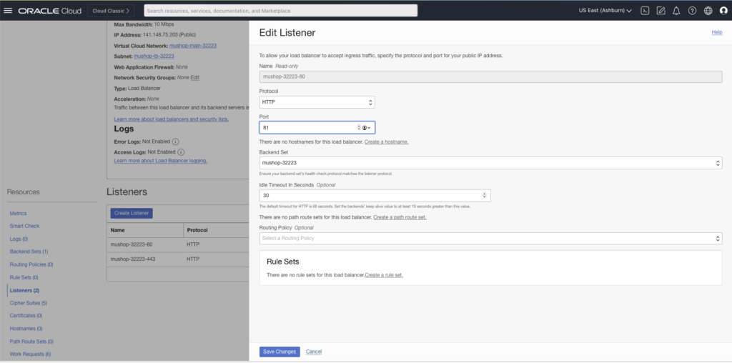 Select the edit option using the three dots symbol at the right end of the port 80 listeners, mushop-xxxxx-80 and modify the listener port from 80 to 81 to break the application, and save changes. You will get work requests submitted and select close requests.