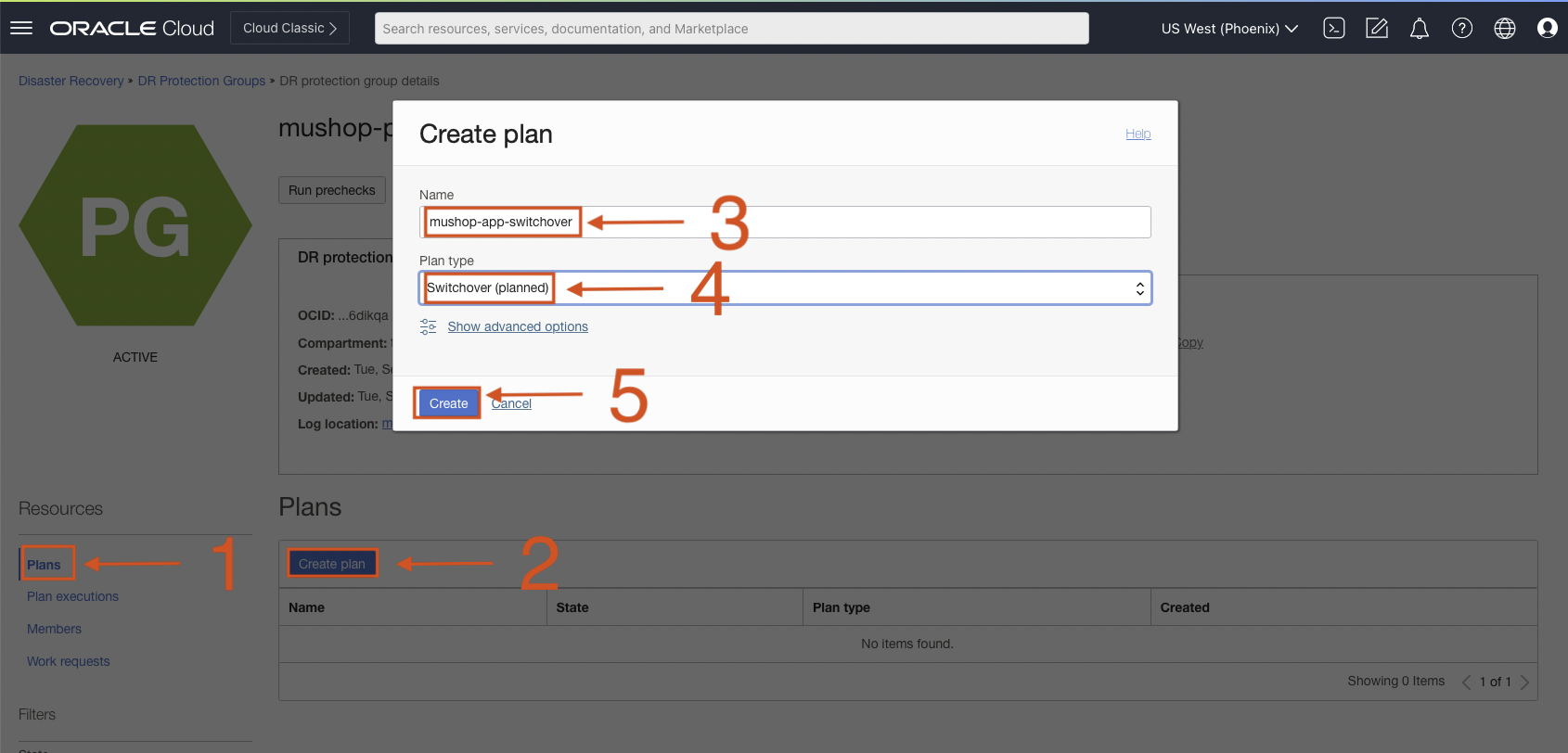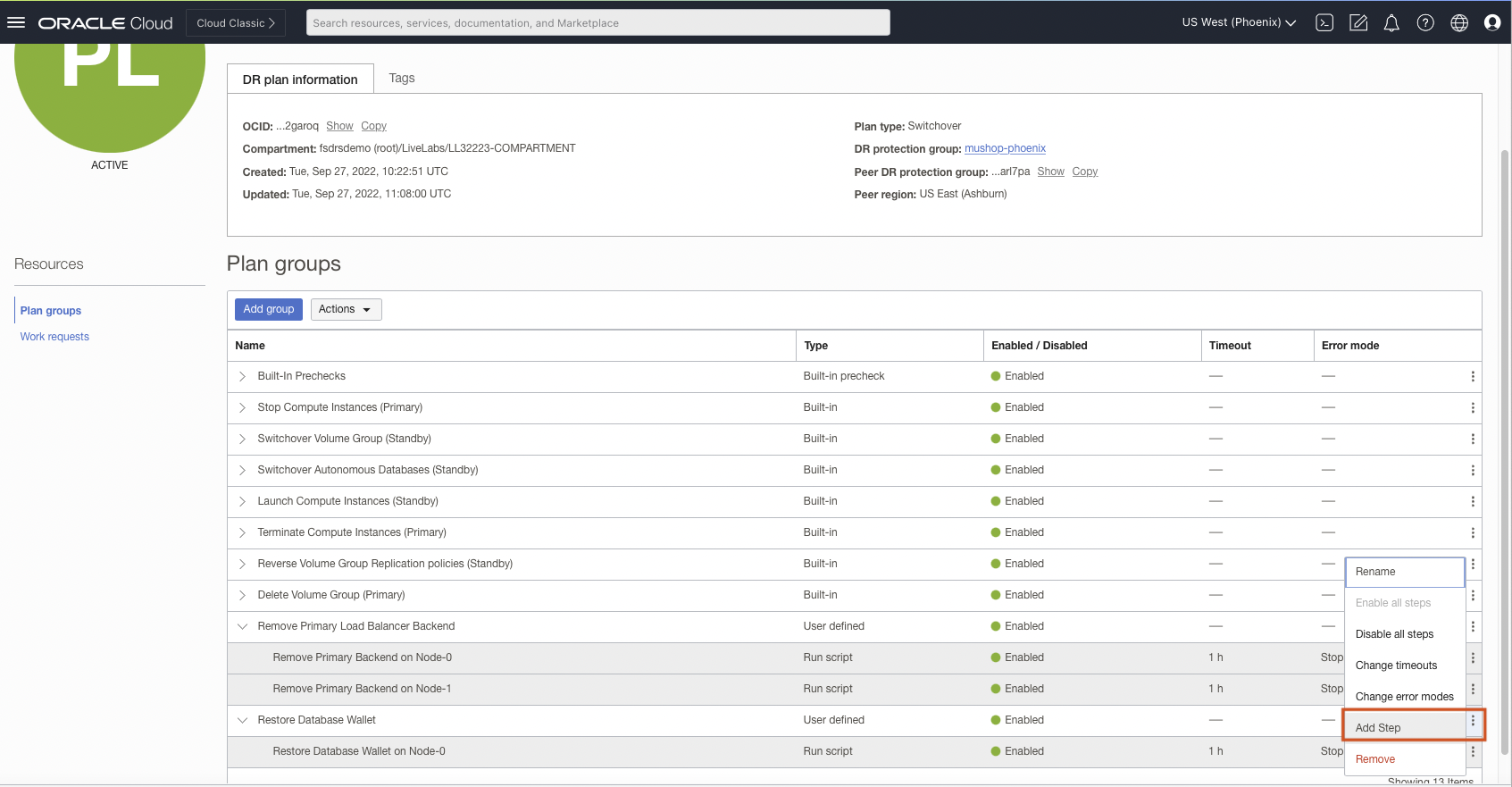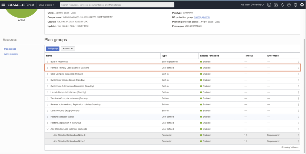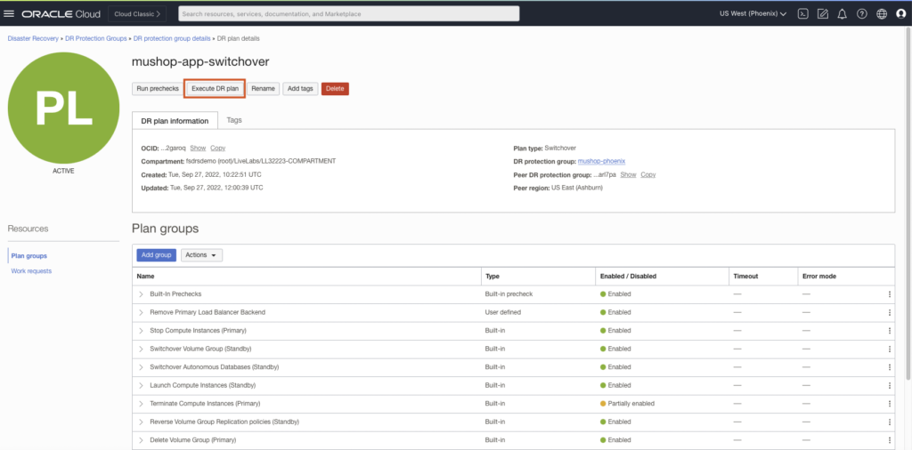 With this step we have all our DRPGs with all it members. Now it is time to create and customise a DR Switchover Plan. At the DRPG page at the standby region (Phoenix):