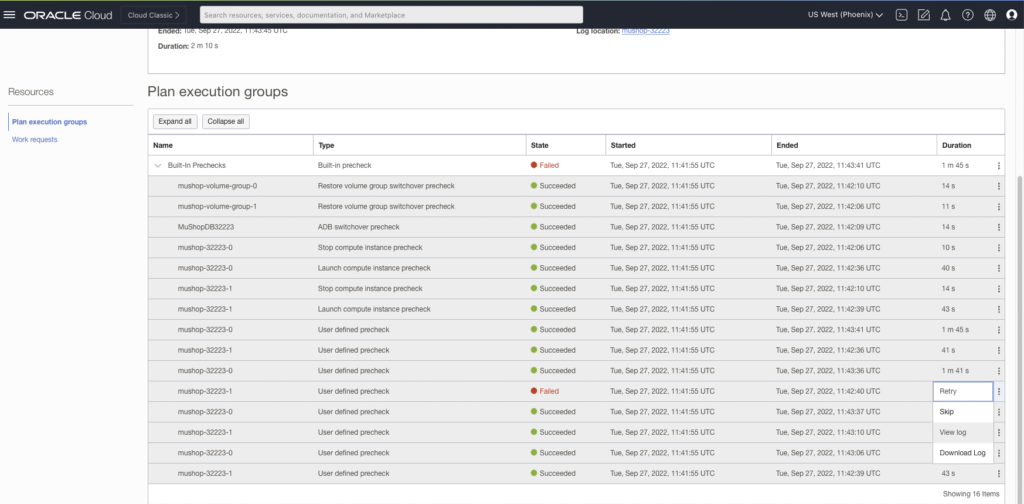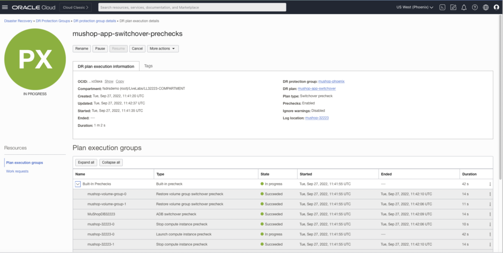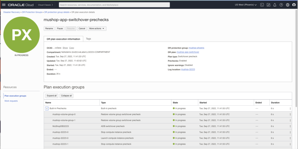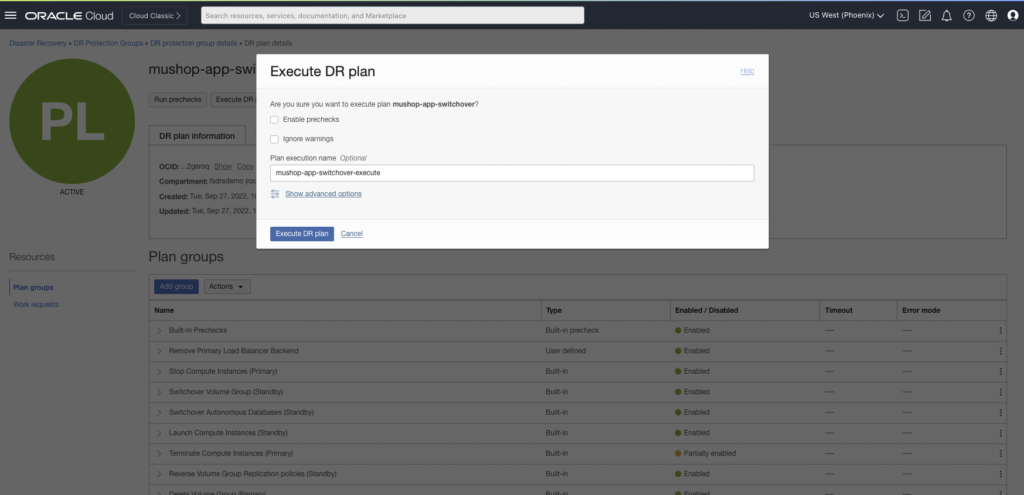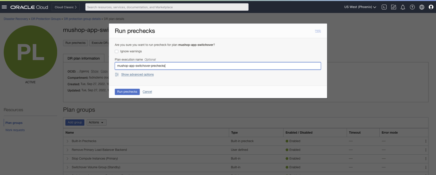 The next step would be to perform a run pre-checks for the mushop-app-switchover plan. Please continue connected to the page in the Phoenix Region (Standby) at the “mushop-app-switchover” and click “Run prechecks“.