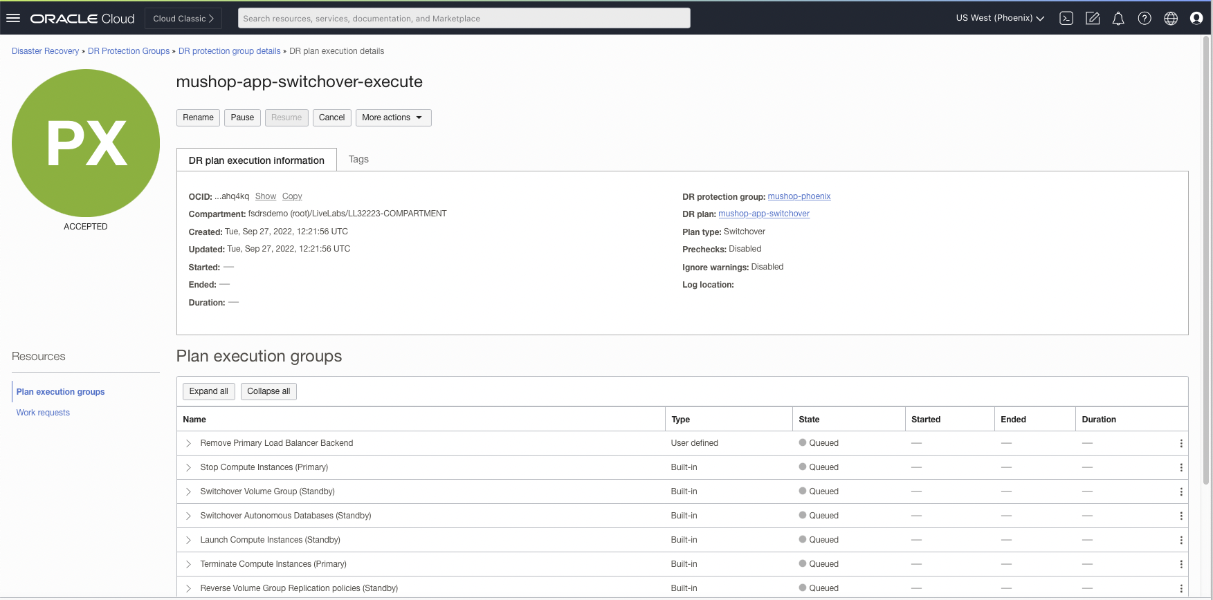 Navigate to Plan executions section under Resources and select the mushop-app-switchover-execute plan execution.Initially, it will show all the steps as Queued.