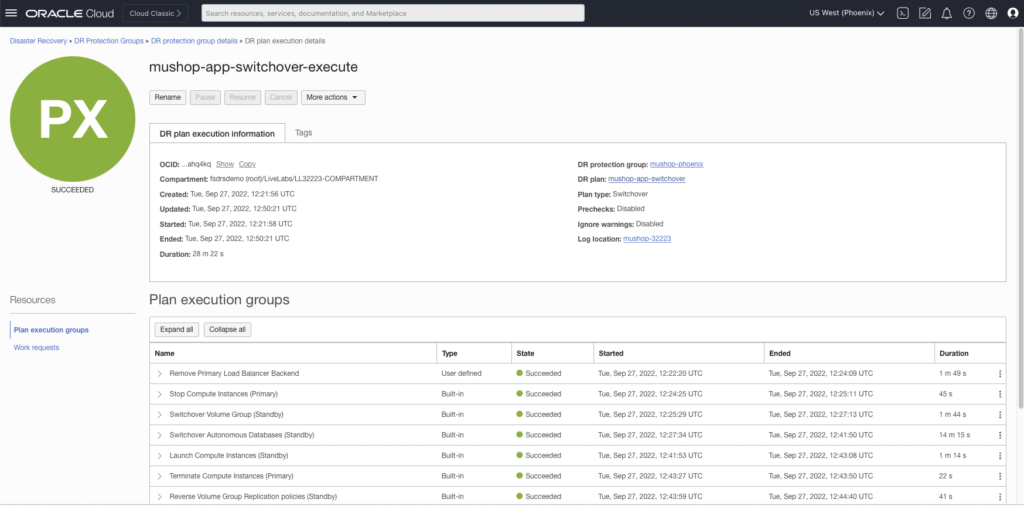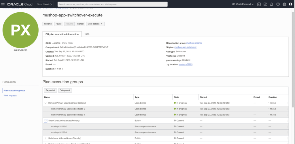 Now we will execute a switchover for mushop-app-switchover plan.Login into OCI Console with your provided Credentials. Select region as Pheonix.Select Migration and Disaster Recovery from the Hamburger menu, then Disaster Recovery -> DR Protection Groups. Verify the region is Phoenix.