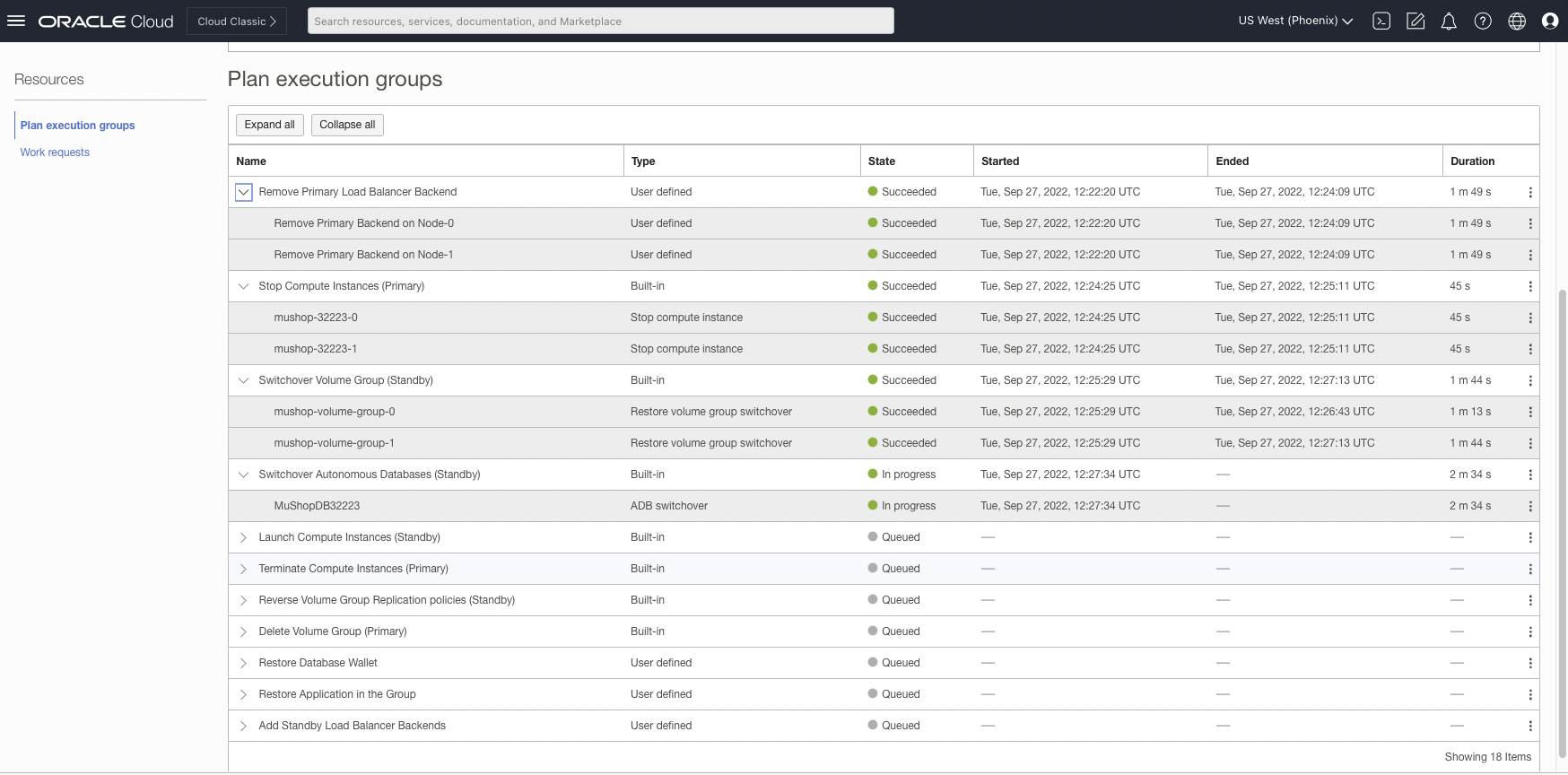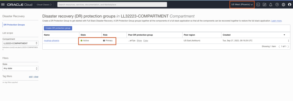 - Notice the Role of the mushop-phoenix DRPG; it has automatically changed to Primary. So, now we have our new primary region as Phoenix region.