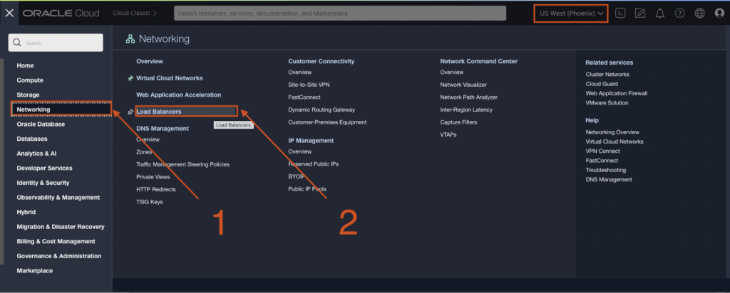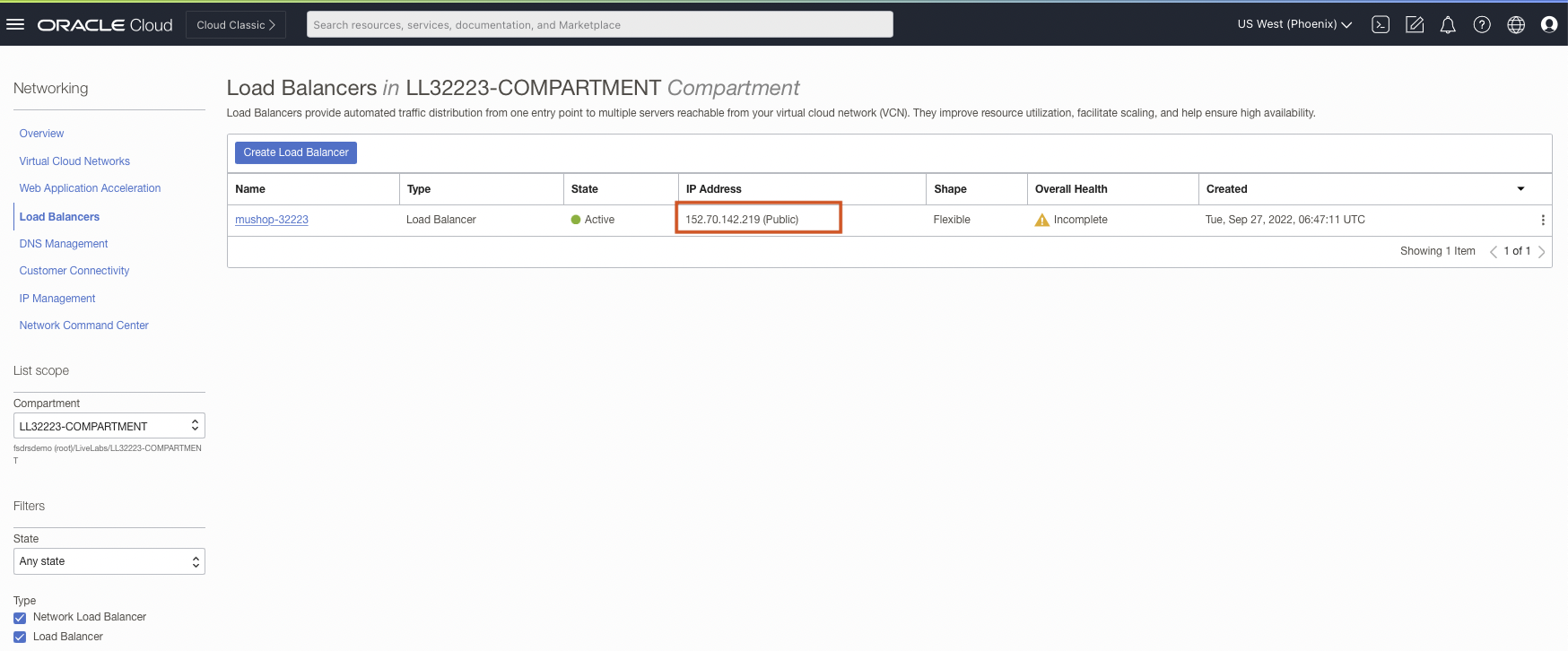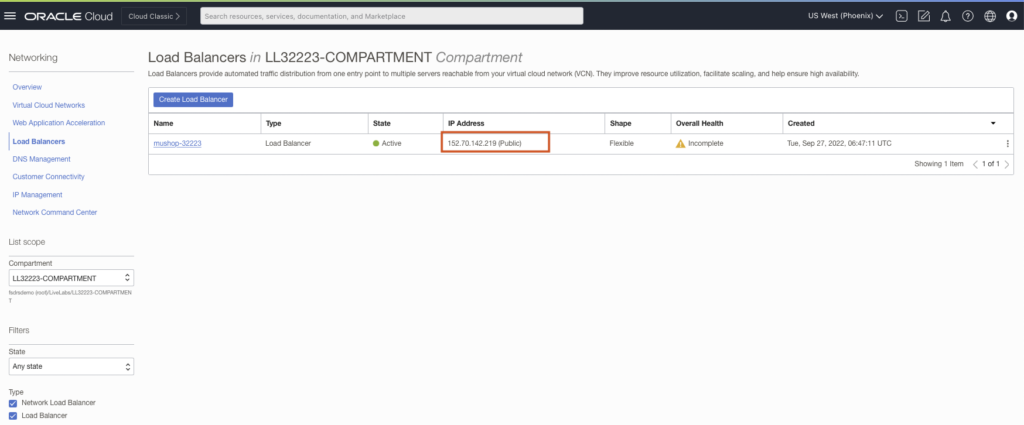 - From the Hamburger menu, select Networking, then Load Balancers – also, please verify that the region in use now is Phoenix and gather the Public IP address of the Load Balancer.